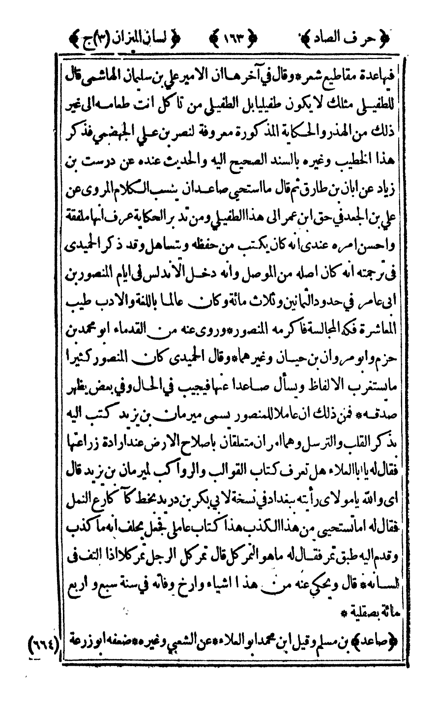 فيها عدة مقاطيع شعر وقال في آخرها إن الأمير علي بن سليمان الهاشمي قال للطفيلي مثلك لا يكون طفيليا بل الطفيلي من تأكل أنت طعامه إلى غير ذلك من الهذر والحكاية المذكورة معروفة لنصر بن علي الجهضمي فذكر هذا الخطيب وغيره بالسند الصحيح إليه والحديث عنده عن درست بن زياد عن أب أن ابن طارق ثم قال ما استحي صاعد أن ينسب الكلام المروي عن علي بن الجعد في حق بن عمر إلى هذا الطفيلي ومن تدبر الحكاية عرف أنها ملفقة وأحسن أمره عندي أنه كان يكتب من حفظه ويتساهل وقد ذكر الحميدي في ترجمته أنه كان أصله من الموصل وأنه دخل الأندلس في أيام المنصور بن أبي عامر في حدود الثمانين وثلاث مائة وكان عالما باللغة والأدب طيب المعاشرة فكه المجالسة فأكرمه المنصور وروى عنه من القدماء أبو محمد بن حزم وأبو مرو أن ابن حيان وغيرهما وقال الحميدي كان المنصور كثيرا ما يستغرب الألفاظ ويسأل صاعدا عنها فيجيب في الحال وفي بعض يظهر صدقه فمن ذلك أن عاملا للمنصور يسمى ميرم أن ابن يزيد كتب إليه بذكر القلب والترسل وهما أمران متعلقان بإصلاح الأرض عند إرادة زراعتها فقال له يا أبا العلاء هل تعرف كتاب القوالب والرواكب لميرم أن ابن يزيد قال أي والله يا مولاي رأيته ببغداد في نسخة لأبي بكر بن دريد بخط كآكارع النمل فقال له أما تستحيى من هذا الكذب هذا كتاب عاملي فجعل يحلف أنه ما كذب وقدم إليه طبق تمر فقال له ما هو التمر كل قال تمر كل الرجل تمر كلا إذا التف في لسانه قال ويحكى عنه من هذا أشياء وأرخ وفاته في سنة س سبع وأربع مائة بصقلية.
