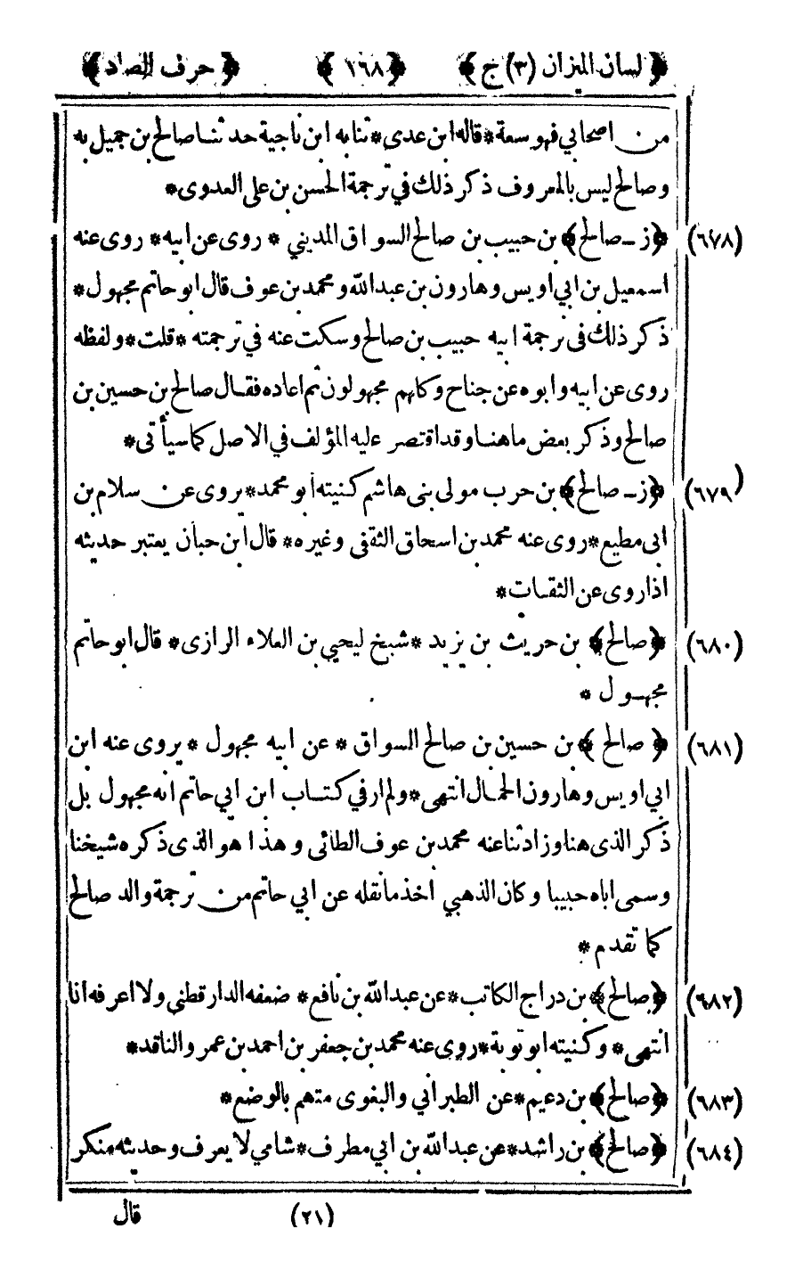 [681] "صالح" بن حسين بن صالح السواق عن أبيه مجهول يروى عنه بن أبي أويس وهارون الحمال انتهى ولم أر في كتاب بن أبي حاتم أنه مجهول بل ذكر الذي هنا وزاد ثنا عنه محمد بن عوف الطائي وهذا هو الذي ذكره شيخنا وسمى أباه حبيبا وكان الذهبي أخذ ما نقله عن أبي حاتم من ترجمة والد صالح كما تقدم.