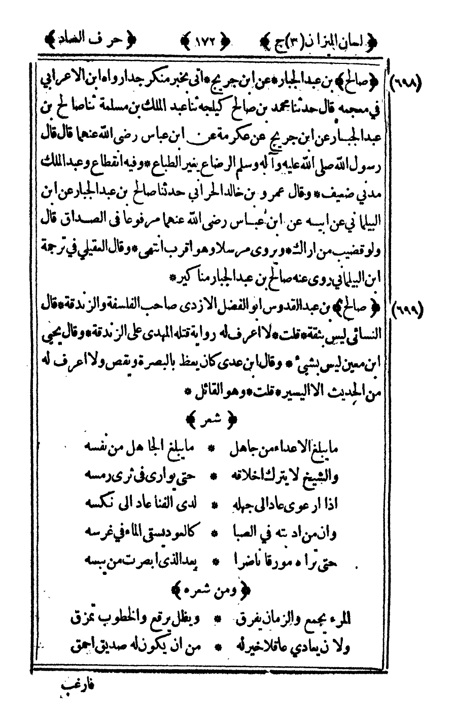 [699] "صالح" بن عبد القدوس أبو الفضل الأزدي صاحب الفلسفة والزندقة قال النسائي ليس بثقة قلت لا اعرف له رواية قتله المهدى على الزندقة وقال يحيى بن معين ليس بشيء وقال ابن عدي كان يعظ بالبصرة ويقص ولا اعرف له من الحديث الا اليسير قلت وهو القائل: