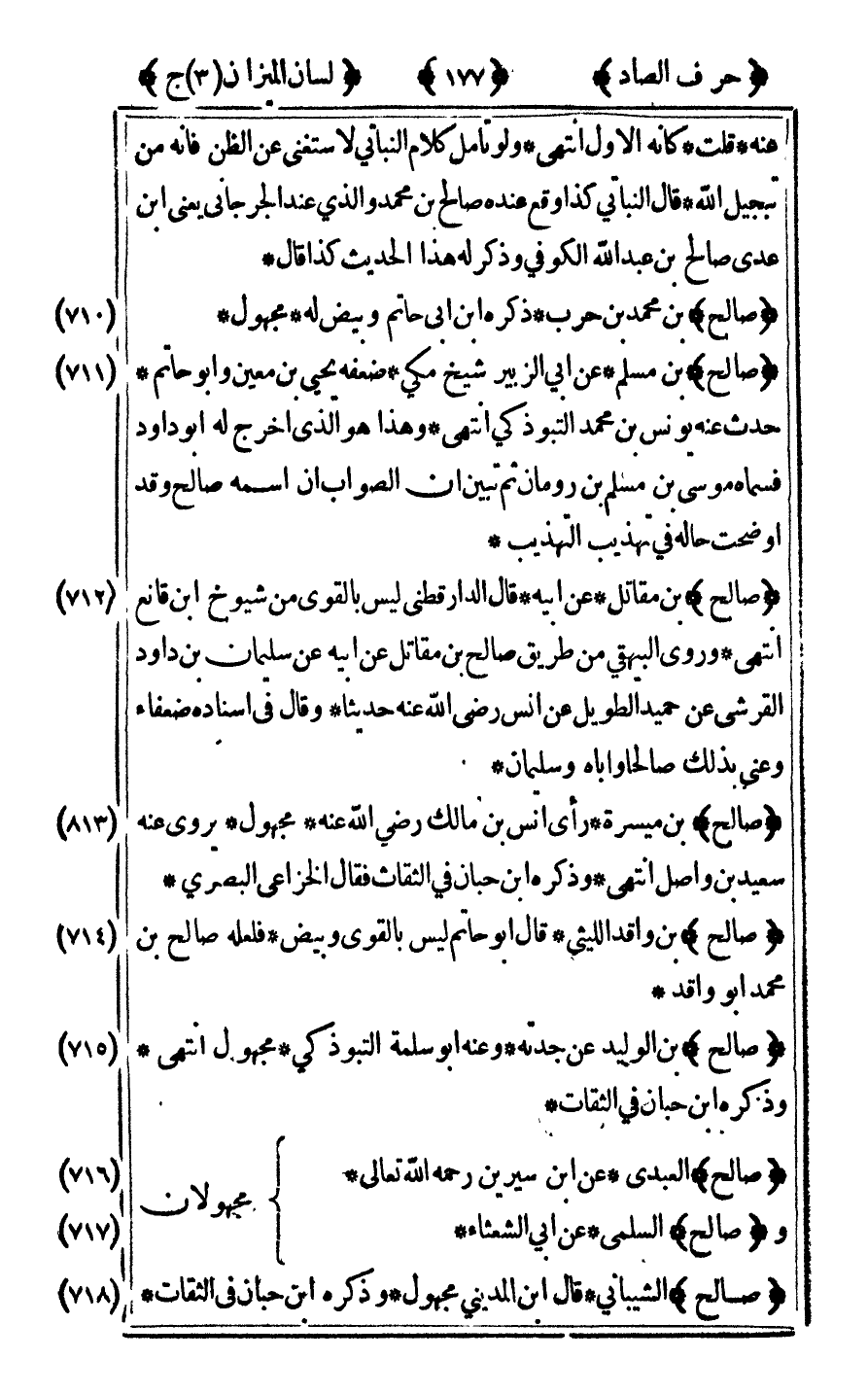 [710] "صالح" بن محمد بن حرب ذكره ابن أبي حاتم وبيض له مجهول.
