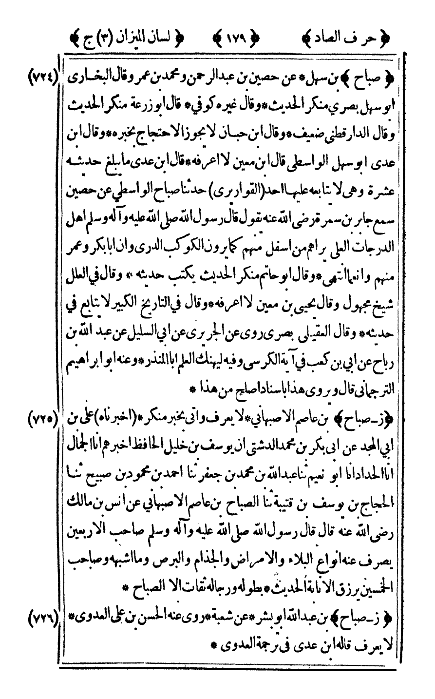 [724] "صباح" بن سهل عن حصين بن عبد الرحمن ومحمد بن عمرو قال البخاري أبو سهل بصري منكر الحديث وقال غيره كوفي قال أبو زرعة منكر الحديث وقال الدارقطني ضعيف وقال ابن حبان لا يجوز الاحتجاج بخيره وقال ابن عدي أبو سهل الواسطي قال ابن معين لا أعرفه قال ابن عدي ما يبلغ حديثه عشرة وهي لا يتابعه عليها أحد القواريرى حدثنا صباح الواسطي عن حصين سمع جابر بن سمرة رضي الله عنه يقول قال رسول الله صلى الله عليه وآله وسلم: "أهل الدرجات العلى يراهم من أسفل منهم كما يرون الكوكب الدري وان أبا بكر وعمر منهم وأنعما" انتهى وقال أبو حاتم منكر الحديث يكتب حديثه وقال في العلل شيخ مجهول وقال يحيى بن معين لا أعرفه وقال في التاريخ الكبير لا يتابع في حديثه وقال العقيلي بصري روى عن الجريري عن أبي السليل عن عبد الله ابن رباح عن أبي بن كعب في آية الكرسي وفيه ليهنك العلم أبا المنذر وعنه أبو إبراهيم الترجماني قال ويروى هذا بإسناد أصلح من هذا.