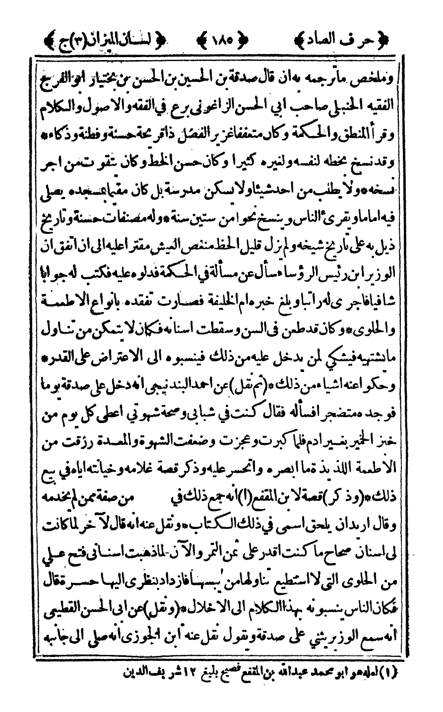 وملخص ما ترجمه به أن قال صدقة بن الحسين بن الحسن بن بختيار أبو الفرج الفقيه الحنبلي صاحب أبي الحسن الزاغونى برع في الفقه والأصول والكلام وقرأ المنطق والحكمة وكان متعففا غزير الفضل ذا قريحة حسنة وفطنة وذكاء وقد نسخ بخطه لنفسه ولغيره كثيرا وكان حسن الخط وكان يتقوت من أجر نسخه ولا يطلب من أحد شيئا ولا يسكن مدرسة بل كان مقيما بمسجده يصلى فيه إماما ويقرئ الناس وينسخ نحوا من ستين سنة وله مصنفات حسنة وتاريخ ذيل به على تاريخ شيخه ولم يزل قليل الحظ منغص العيش مقترا عليه إلى أن اتفق أن الوزير بن رئيس الرؤساء سأل عن مسألة في الحكمة فدلوه عليه فكتب له جوابا شافيا فأجرى له راتبا وبلغ خبره أم الخليفة فصارت تفقده بأنواع الأطعمة والحلوى وكان قد طعن في السن وسقطت أسنأنه فكان لا يتمكن من تناول ما يشتهيه فيشكى لمن يدخل عليه من ذلك فينسبوه إلى الاعتراض على القدر وحكوا عنه أشياء من ذلك ثم نقل عن أحمد البندنيجى أنه دخل على صدقة يوما فوجده متضجرا فسأله فقال كنت في شبابى وصحة شهوتي أعطى كل يوم من خبز الخمير بغير آدم فلما كبرت وعجزت وضعفت الشهوة والمعدة رزقت من الأطعمة اللذيذة ما أبصره وأتحسر عليه وذكر قصة غلامه وخيانته إياه في بيع ذلك وذكر قصة لابن المقفع1 أنه جمع ذلك في من صفة ممن لم يخدمه وقال أريد أن يلحق اسمى في ذلك الكتاب ونقل عنه أنه قال لآخر لما كانت لي أسنان صحاح ما كنت أقدر على ثمن التمر والآن لما ذهبت أسنانى فتح علي من الحلوى التي لا أستطيع تناولها من تيبسها فازداد بنظري إليها حسرة قال فكان الناس ينسبونه بهذا الكلام إلى الإخلال ونقل عن أبي الحسن القطيعي أنه سمع الوزير يثنى علي صدقة ويقول نقل عنه بن الجوزي أنه صلى إلى جانبه