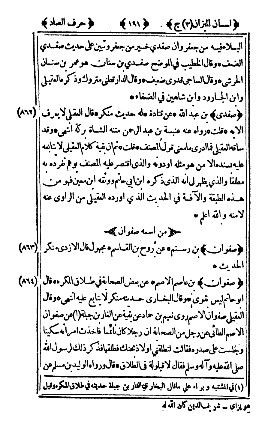 البلاء فيه من جعفر وأن صفدي خير من جعفر وتبين على حديث صفدي الضعف وقال الخطيب في الموضح صفدي بن سنان هو عمر بن سنان الحرشي وقال الساجي قدري ضعيف وقال الدارقطني متروك وذكره العقيلي وابن الجارود وابن شاهين في الضعفاء.