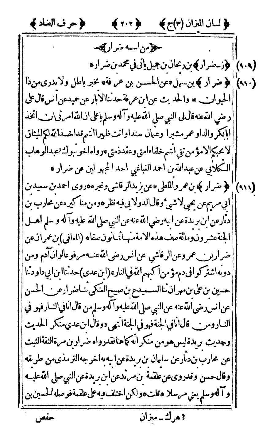 [911] "ضرار" بن عمرو الملطي عن يزيد الرقاشي وغيره روى أحمد بن سعيد بن أبي مريم عن يحيى لا شيء وقال الدولابي فيه نظر ومن مناكير عن محارب بن دثار عن ابن بريدة عن أبيه رضي الله عنه عن النبي صلى الله عليه وآله وسلم أهل الجنة عشرون ومائة صف هذه الأمة منها ثمانون صفا المعافي بن عمران عن ضرار بن عمرو عن الرقاشي عن أنس رضي الله عنه مرفوعا "لو أن آدم ومن دونه اشتركوا في دم مؤمن أكبهم الله في النار" بن عدي حدثنا بن أبي داود ثنا حسين بن علي بن مهران ثنا السميدع بن صبيح العتكي ثنا ضرار عن الحسن عن أنس رضي الله عنه عن النبي صلى الله عليه وآله وسلم "من قال أنا في النار فهو في النار ومن قال أنا في الجنة فهو في الجنة" انتهى وقال ابن عدي منكر الحديث وحديث بريدة ليس هو من منكراته كما هنا فقد رواه ضرار بن مرة الثقة الثبت عن محارب بن دثار عن سليمان ابن بريدة عن أبيه به أخرجه الترمذي من طريقه وقال حسن وقد روى عن علقمة بن مرثد عن ابن بريدة عن النبي صلى الله عليه وآله وسلم يعنى مرسلا قلت ولكن اختلف فيه على علقمة فوصله الحسين بن