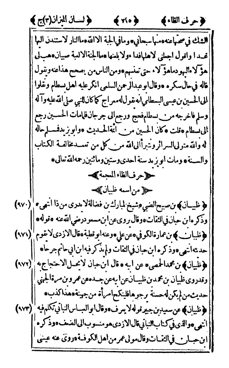 [970] "ظبيان" ابن صبيح الضبي شيخ لمبارك بن فضالة لا يدرى من ذا انتهى وذكره ابن حبان في الثقات وقال يروى عن ابن مسعود رضي الله عنه قوله.