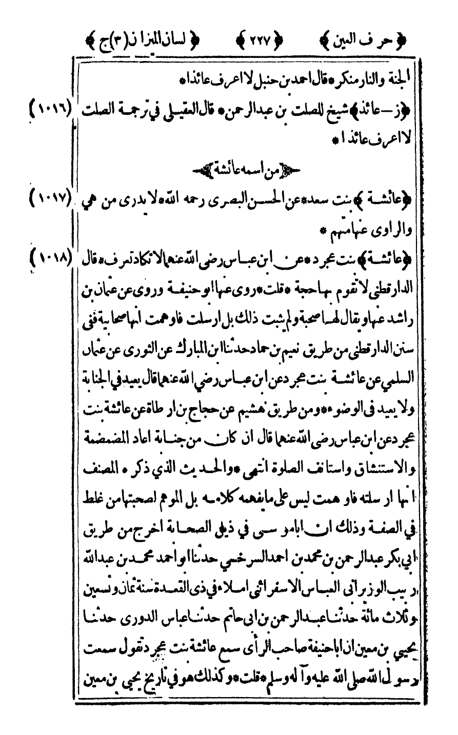 [1018] "عائشة" بنت عجرد عن ابن عباس رضي الله عنهما لا تكاد تعرف قال الدارقطني لا تقوم بها حجة قلت روى عنها أبو حنيفة وروى عن عثمان ابن راشد عنها ويقال لها صحبة ولم يثبت ذلك بل أرسلت فأوهمت أنها صحابية ففي سنن الدارقطني من طريق نعيم بن حماد حدثنا بن المبارك عن الثوري عن عثمان السلمي عن عائشة بنت عجرد عن ابن عباس رضي الله عنهما قال يعيد في الجنابة ولا يعيد في الوضوء ومن طريق هشيم عن حجاج بن أرطأة عن عائشة بنت عجرد عن ابن عباس رضي الله عنهما قال إن كان من جنابة أعاد المضمضمة والاستنشاق واستانف الصلاة انتهى والحديث الذي ذكره المصنف أنها أرسلته فأوهمت ليس على ما يفهمه كلامه بل الموهم لصحبتها من غلط في الصفة وذلك أن أبا موسى في ذيل الصحابة أخرج من طريق أبي بكر عبد الرحمن بن محمد بن أحمد السرخسي حدثنا أبو أحمد محمد بن عبد الله ربيب الوزير أبي العباس الإسفرائيني إملاء في ذي القعدة سنة ثمان وتسعين وثلاث مائة حدثنا عبد الرحمن بن أبي حاتم حدثنا عباس الدوري حدثنا يحيى بن معين أن أبا حنيفة صاحب الرأي سمع عائشة بنت عجرد تقول سمعت رسول الله صلى الله عليه وآله وسلم قلت وكذلك هو في تاريخ يحيى بن معين
