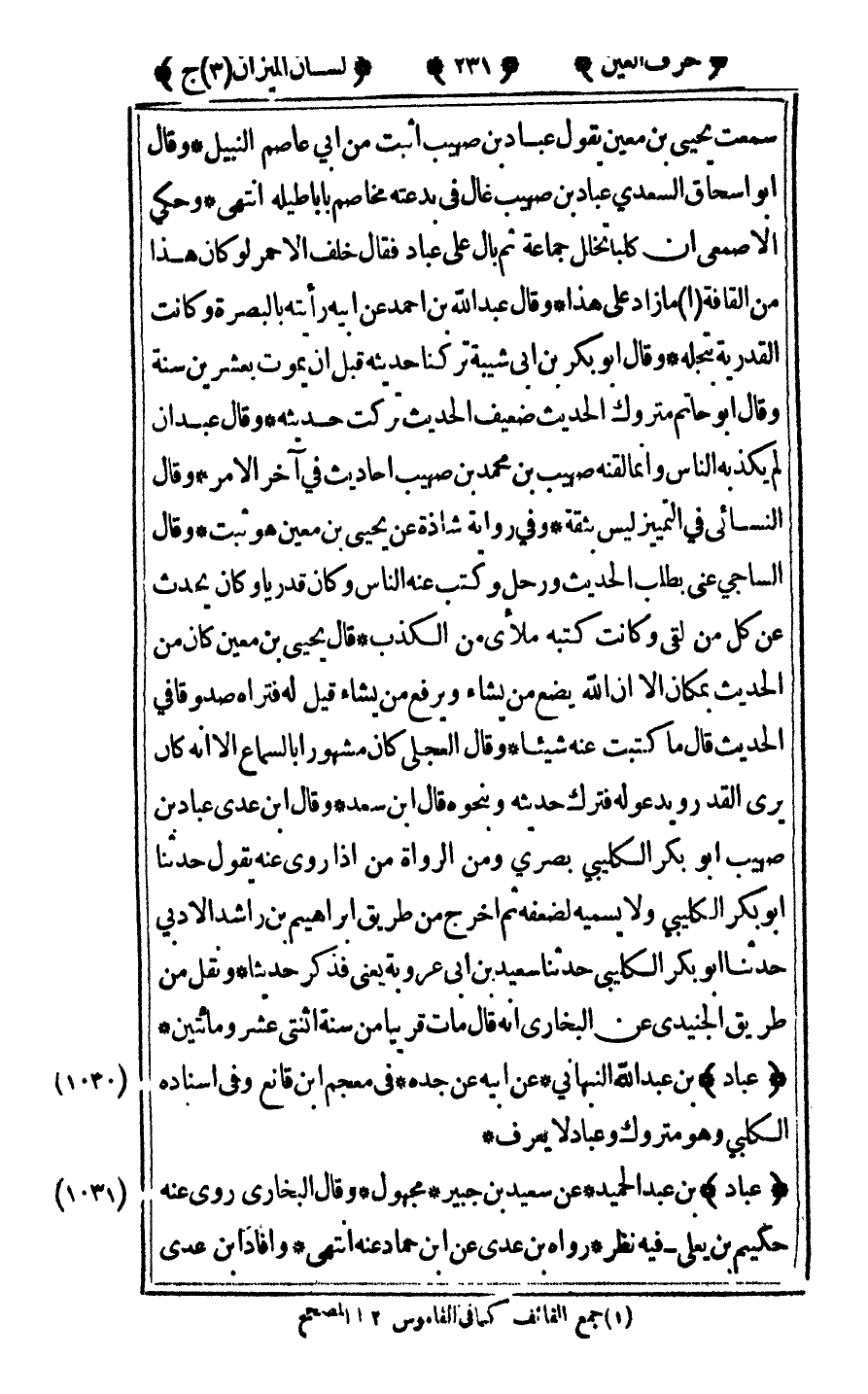 [1031] "عباد" بن عبد الحميد عن سعيد بن جبير مجهول وقال البخاري روى عنه حكيم بن يعلى فيه نظر رواه بن عدي عن ابن حماد عنه انتهى وأفاد بن عدي
