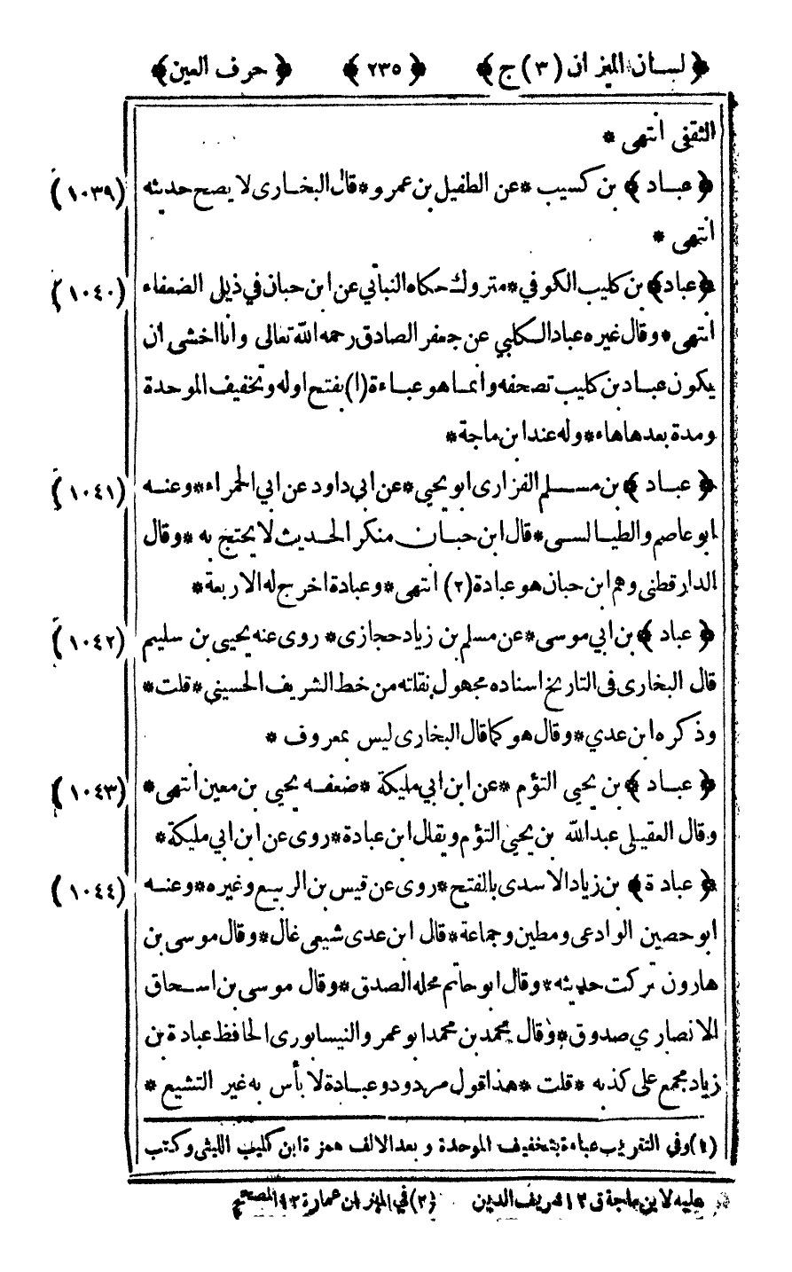 [1040] "عباد" بن كليب الكوفي متروك حكاه النباتي عن ابن حبان في ذيل الضعفاء انتهى وقال غير عباد الكلبي عن جعفر الصادق رحمه الله تعالى وأنا أخشى أن يكون عباد بن كليب تصحفه وإنما هو عباءة1 بفتح أوله وتخفيف الموحدة ومدة بعدها هاء وله عند بن ماجة.