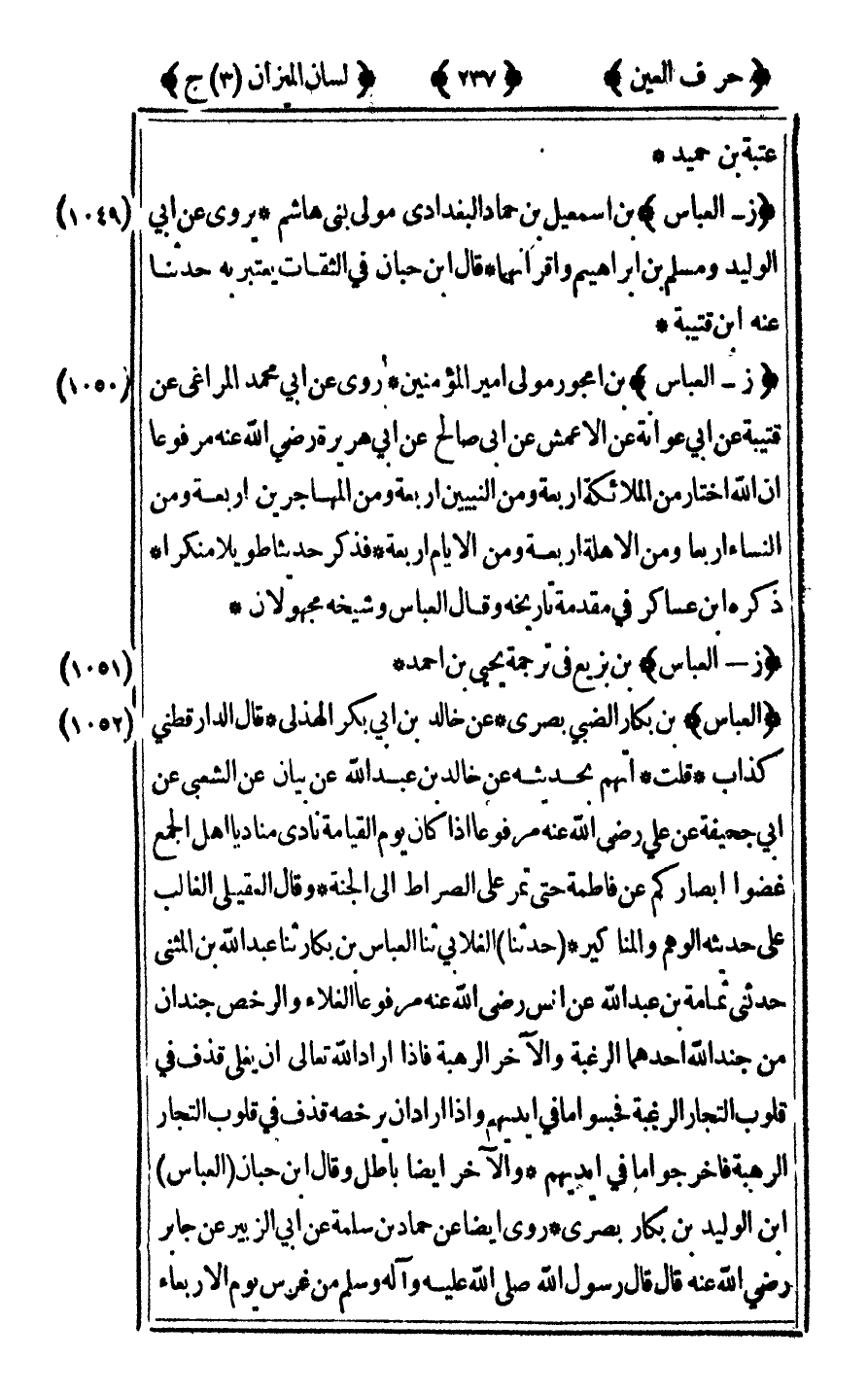 [1049] "ز - العباس" بن إسماعيل بن حماد البغدادي مولى بنى هاشم يروى عن أبي الوليد ومسلم بن إبراهيم واقرأنهما قال ابن حبان في الثقات يعتبر به حدثنا عنه بن قتيبة.