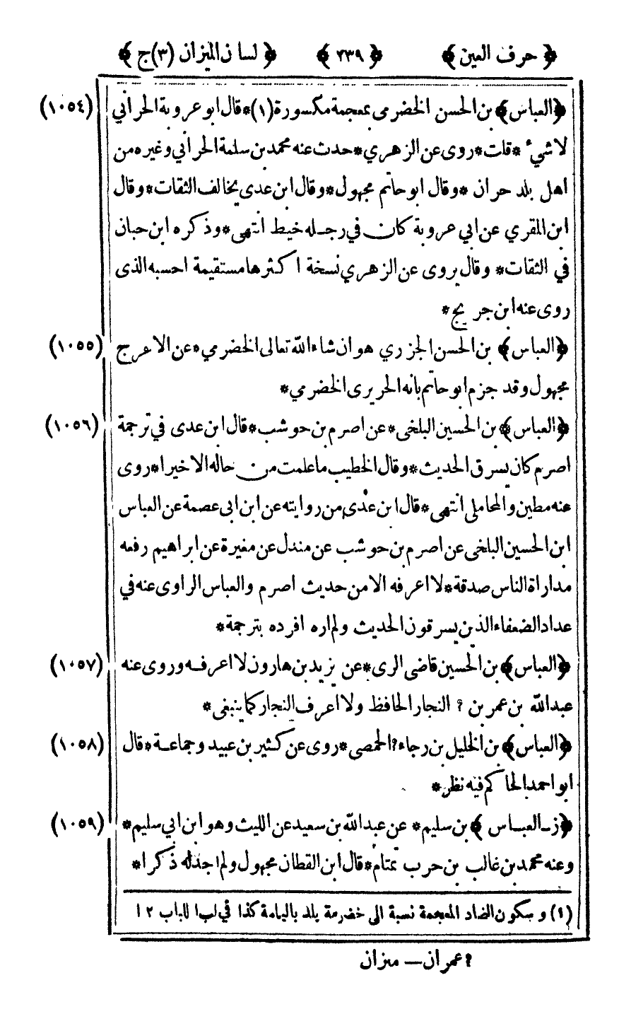 [1054] "العباس" بن الحسن الخضرمى بمعجمة مكسورة1 قال أبو عروبة الحراني لا شيء قلت روى عن الزهرى حدث عنه محمد بن سلمة الحراني وغيره من أهل بلد حران وقال أبو حاتم مجهول وقال ابن عدي يخالف الثقات وقال ابن المقري عن أبي عروبة كان في رجله خيط انتهى وذكره ابن حبان في الثقات وقال يروى عن الزهرى نسخة أكثرها مستقيمة أحسبه الذي روى عنه بن جريج.