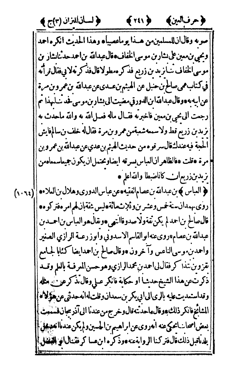 [1064] "العباس" بن عبد الله ابن عصام الفقيه عن عباس الدوري وهلال بن العلاء روى بهمدان سنة خمس وعشرين وثلاث مائة ليس بثقة بان لهم أمره فتركوه قال صالح بن أحمد لم يكن ثقة ولا صدوقا انتهى ويقال هو العباس بن أحمد بن عبد الله ابن عصام روى عنه أبو القاسم الأسدونى وأبو زرعة الرازي الصغير وأحمد بن موسى الناعس وآخرون وقال صالح بن أحمد أيضا كنا بالجامع بقزوين نتذاكر فقال لي أحمد بن محمد الرازي وهو حسن المعرفة بالعلم وقد ذكرت عن هذا الشيخ حديثا أو حكاية فأنكر علي وقال تذكر عن مثله وقد استعديت عليه بالري إلى أبي بكر بن سعدان وقلت له أنه حدثني عن هؤلاء المشايخ فأنكر ذلك وقال ما حدثته قال وخرج من عندنا إلى أذربيجان فسمعت بعض أصحابنا يحكى عنه أنه روى عن إبراهيم بن الحسين ولم يكن عندنا أنه دخل بلدنا قبل ذلك قال فتركنا الرواية عنه وذكره ابن عساكر فقال أبو الفضل