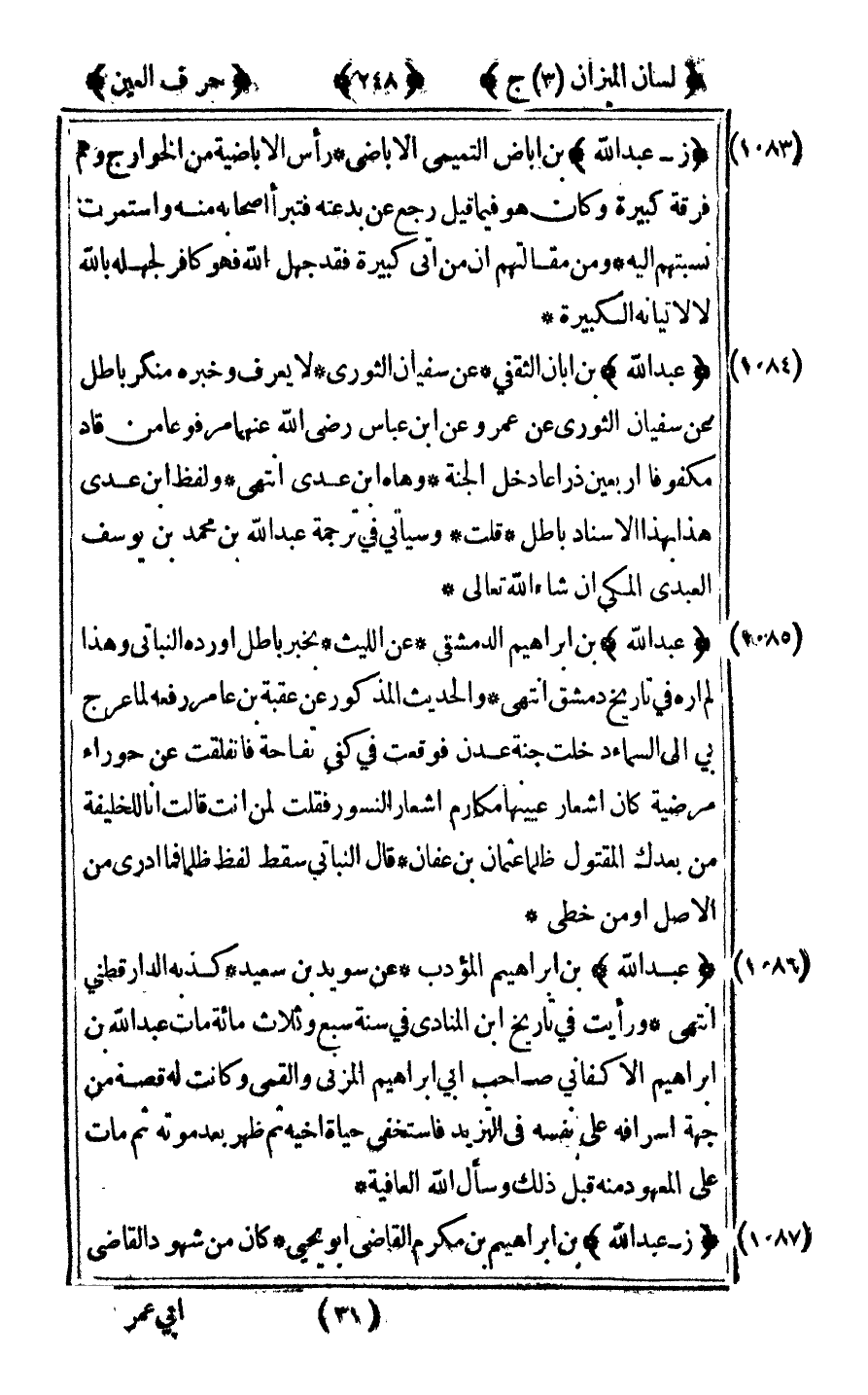[1083] "ز - عبد الله" ابن أباض التميمي الإباضي رأس الإباضية من الخوارج وهم فرقة كبيرة وكان هو فيما قيل رجع عن بدعته فتبرأ أصحابه منه واستمرت نسبتهم إليه ومن مقالتهم أن من أتى كبيرة فقد جهل الله فهو كافر لجهله بالله لا لاتيأنه الكبيرة.