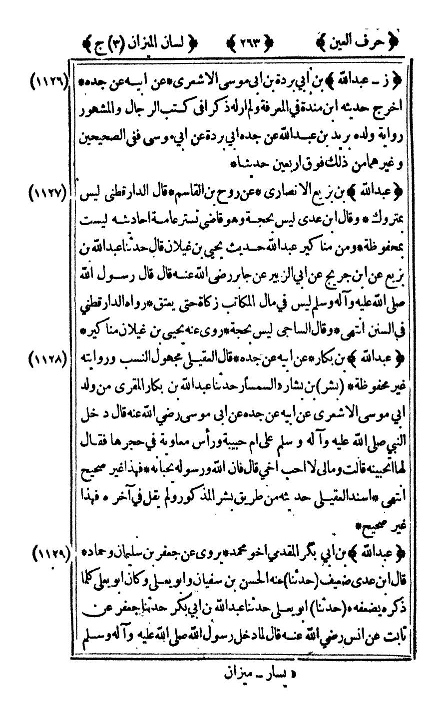 [1126] "ز - عبد الله" ابن أبي بردة بن أبي موسى الأشعري عن أبيه عن جده أخرج حديثه بن مندة في المعرفة ولم أر له ذكرا في كتب الرجال والمشهور رواية ولده بريد بن عبد الله عن جده أبي بردة عن أبي موسى ففي الصحيحين وغيرهما من ذلك فوق أربعين حديثا.