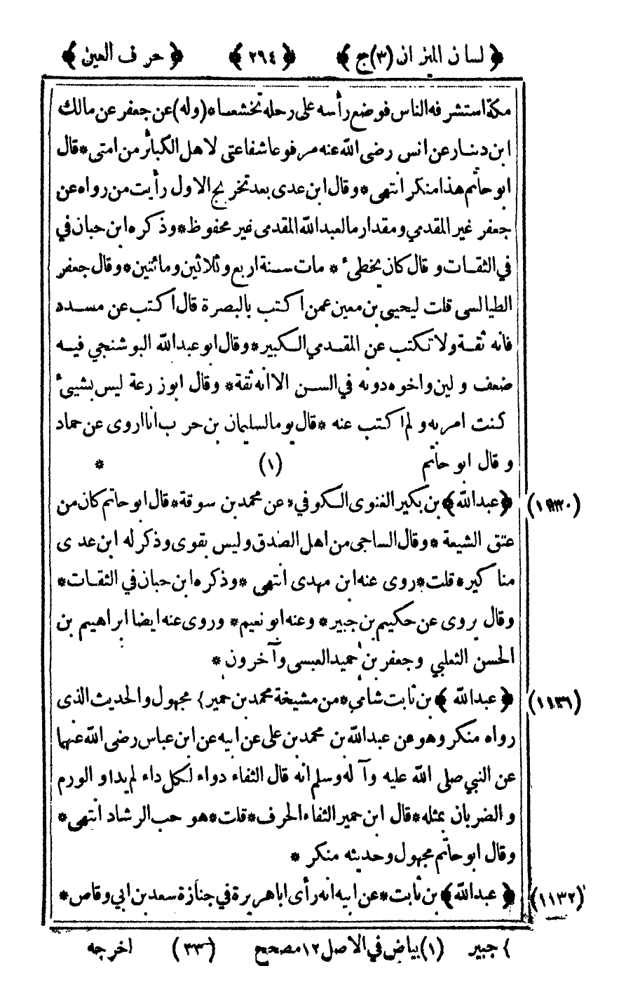 [1131] "عبد الله" ابن ثابت شامي من مشيخة محمد بن حمير2 مجهول والحديث الذي رواه منكر وهو عن عبد الله ابن محمد بن علي عن أبيه عن ابن عباس رضي الله عنهما عن النبي صلى الله عليه وآله وسلم أنه قال: "الثفاء دواء لكل داء لم يداو الورم والضربان بمثله" قال ابن حمير الثفاء الحرف قلت هو حب الرشاد انتهى وقال أبو حاتم مجهول وحديثه منكر.