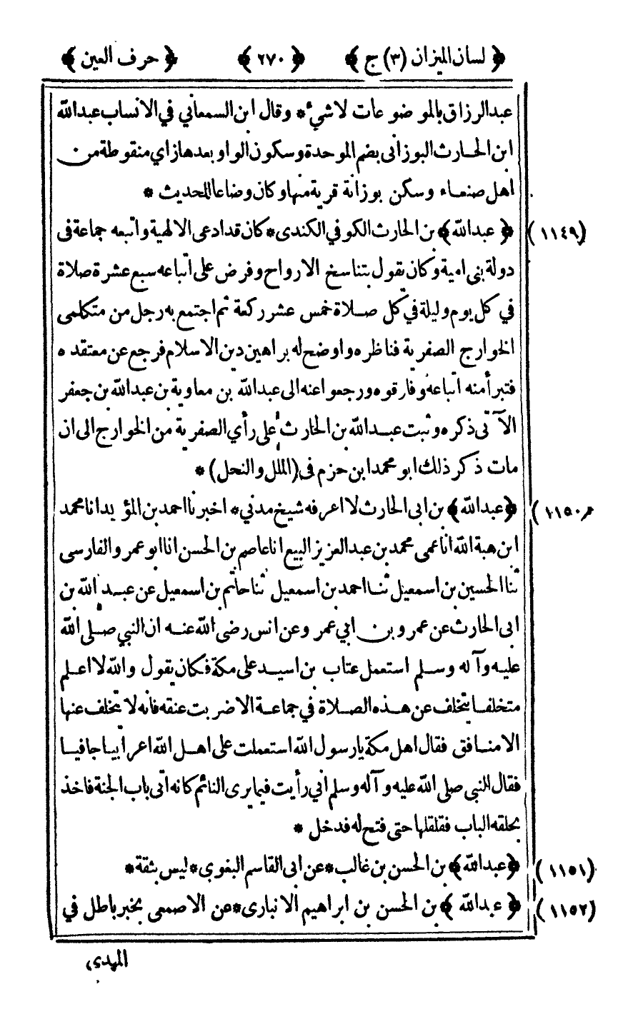 [1149] "عبد الله" ابن الحارث الكوفي الكندي كان قد ادعى الإلهية واتبعه جماعة في دولة بني أمية وكان يقول بتناسخ الأرواح وفرض على اتباعه سبع عشرة صلاة في كل يوم وليلة في كل صلاة خمس عشر ركعة ثم اجتمع به رجل من متكلمي الخوارج الصفرية فناظره وأوضح له براهين دين الإسلام فرجع عن معتقده فتبرأ منه اتباعه وفارقوه ورجعوا عنه إلى عبد الله ابن معاوية بن عبد الله ابن جعفر الآتي ذكره وثبت عبد الله ابن الحارث على رأي الصفرية من الخوارج إلى أن مات ذكر ذلك أبو محمد بن حزم في الملل والنحل.
