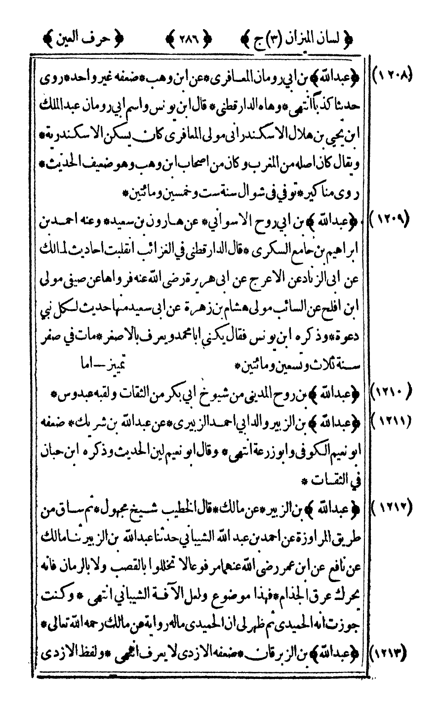 [1211] "عبد الله" ابن الزبير والد أبي أحمد الزبيري عن عبد الله ابن شريك ضعفه أبو نعيم الكوفي وأبو زرعة انتهى وقال أبو نعيم لين الحديث وذكره ابن حبان في الثقات.