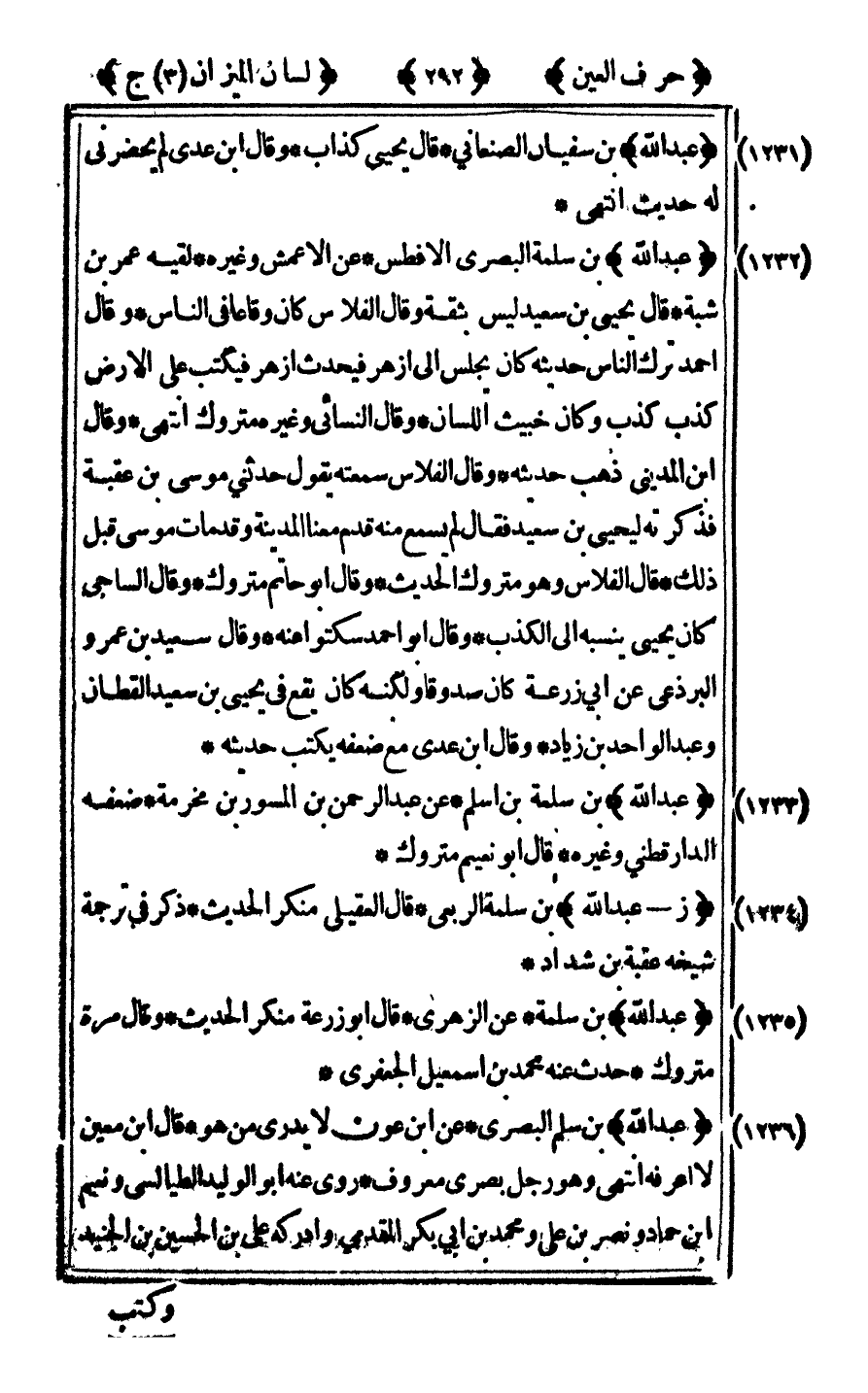 [1236] "عبد الله" ابن سلم البصري عن ابن عون لا يدري من هو قال ابن معين لا أعرفه انتهى وهو رجل بصري معروف روى عنه أبو الوليد الطيالسي ونعيم بن حماد ونصر بن علي ومحمد بن أبي بكر المقدمي وأدركه على بن الحسين بن الجنيد