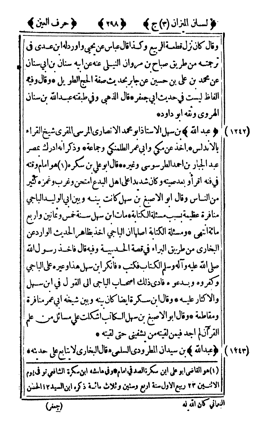 [1242] "عبد الله" ابن سهل الإستاذ أبو محمد الأنصاري المرسي المقري شيخ القراء بالأندلس أخذ عن مكي وأبي عمر الطلمنكي وجماعة وذكر أنه أدرك بمصر عبد الجبار بن أحمد الطرسوسي وغيره قال أبو علي بن سكره1 هو أمام وقته في فنه أقرأ وبعد صَيتِه وكان شديدا على أهل البدع امتحن وغرب وغمزه كثير من الناس وقال أبو الأصبغ بن سهل كانت بينه وبين أبي الوليد الباجي منافرة عظيمة بسبب مسألة الكتابة مات بن سهل سنة خمس وثماين وأربع مائة انتهى ومسئلة الكتابة أصلها أن الباجي أخذ بظاهر الحديث الوارد عن البخاري من طريق البراء في قصة الحديبية وفيه قال فأخذ رسول الله صلى الله عليه وآله وسلم الكتاب فكتب فأنكر بن سهل هذا وعيره على الباجي وكفروه وبدعوه فادى ذلك أصحاب الباجي إلى القول في بن سهل والإكثار عليه وقال ابن سكرة أيضا كان بينه وبين شيخه أبي عمر منافرة ومقاطعة وقال أبو الأصبغ بن سهل الكاتب أشكلت علي مسائل من علم القرآن لم أجد فيمن لقيته من يشفيني حتى لقيته