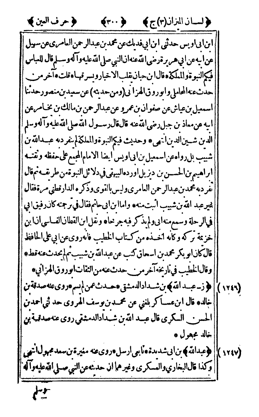 ابن أبي أويس حدثني بن أبي فديك عن محمد بن عبد الرحمن العامري عن سهيل عن أبيه عن أبي هريرة رضي الله عنه أن النبي صلى الله عليه وآله وسلم قال للعباس: "فيكم النبوة والمملكة" قال ابن حبان يقلب الأخبار ويسرقها قلت آخر من حدث عنه المحاملي وأبو روق الهزاني ومن حديثه عن سعيد بن منصور حدثنا إسماعيل بن عياش عن صفو أن ابن عمرو عن عبد الرحمن بن مالك بن يخامر عن أبيه عن معاذ بن جبل رضي الله عنه قال: قال رسول الله صلى الله عليه وآله وسلم "الدين شين الدين" انتهى وحديث "فيكم النبوة والمملكة" لم ينفرد به عبد الله ابن شبيب بل رواه عن إسماعيل بن أبي أويس أيضا الإمام المجمع على حفظه وثقته إبراهيم بن الحسن بن ديزيل أورده البيهقي في دلائل النبوة من طريقه ثم قال تفرد به محمد بن عبد الرحمن العامري وليس بالقوي وذكره الدارقطني مرة فقال غير عبد الله ابن شبيب أثبت منه وأما ابن أبي حاتم فقال في ترجمته كان رفيق أبي في الرحلة وسمع منه أبي ولم يذكر فيه جرحا ونقل ابن القطان الفاسي أن ابن خزيمة تركه وكأنه أخذه من كتاب الخطيب فأنه روى عن أبي على الحافظ قال كان أبو بكر محمد بن إسحاق كتب عن عبد الله ابن شبيب ثم لم يحدث عنه قط وقال الخطيب في تاريخه آخر من حدث عنه من الثقات أبو روق الهزاني.