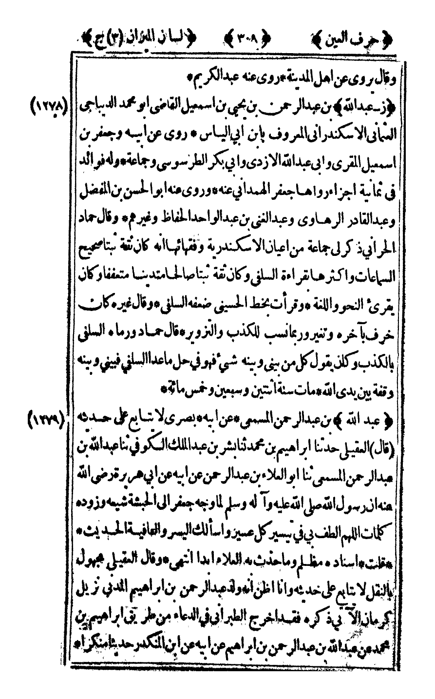 [1279] "عبد الله" ابن عبد الرحمن المسمعي عن أبيه بصري لا يتابع على حديثه قال العقيلي حدثنا إبراهيم بن محمد ثنا بشر بن عبد الملك الكوفي ثنا عبد الله ابن عبد الرحمن المسمعي ثنا أبو العلاء بن عبد الرحمن عن أبيه عن أبي هريرة رضي الله عنه أن رسول الله صلى الله عليه وآله وسلم لما وجه جعفر إلى الحبشة شيعه وزوده كلمات "اللهم ألطف بي في تيسير كل عسير وأسألك اليسر والعافية" الحديث قلت إسناد مظلم وما حدث به العلاء أبدا انتهى وقال العقيلي مجهول بالنقل لا يتابع على حديثه وأنا أظن أنه ولد عبد الرحمن بن إبراهيم المدني نزيل كرمان الآتي ذكره فقد أخرج الطبراني في الدعاء من طريق إبراهيم بن محمد عن عبد الله ابن عبد الرحمن بن إبراهيم عن أبيه عن ابن المنكدر حديثا منكرا