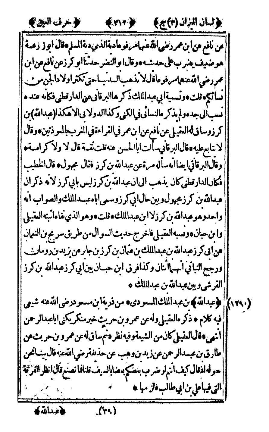[1280] "عبد الله" ابن عبد الرحمن مدني لا يعرف روى عنه عبد الله ابن زياد بن سمعان ذكر بن عدي من طريق أحمد بن صالح المصري عن ابن وهب قلت لابن سمعان من عبد الله ابن عبد الرحمن الذي رويت عنه قال لقيته في البحر.