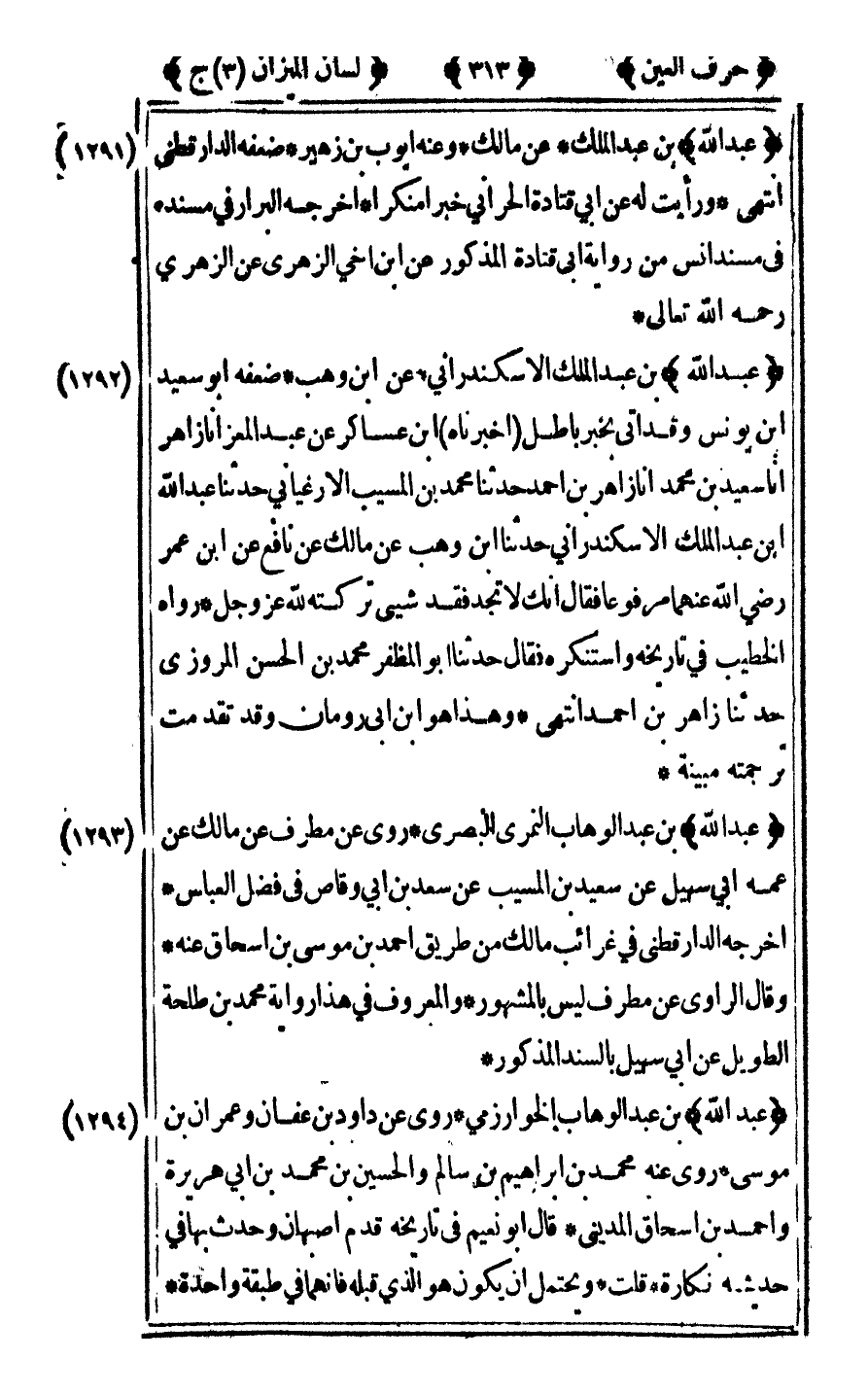 [1288] "عبد الله" ابن عبد المجيد روى عن الزهري عن أبي سلمة عن أبي هريرة رضي الله عنه حديث "فضل العالم على العابد سبعين درجة" الحديث وعنه علي بن ثابت الجزري قال عبد الغني بن سعيد سألت الدارقطني عنه فقال هو عبد الله ابن محرز قلت وعبد الله ابن محرز ضعيف جدا له ترجمة في التهذيب وقد خولف عبد الله ابن محرز في سنده فأخرج أبو يعلى في مسنده من طريق الخليل بن مرة عن ميسرة عن الزهري عن أبي سلمة عن أبيه عبد الرحمن بن عوف.