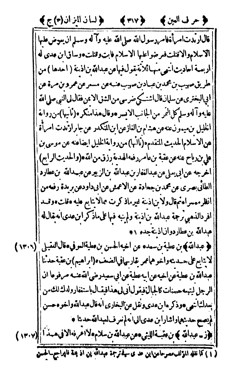 [1301] "عبد الله" ابن عصمة النصيبي عن حماد بن سلمة وغيره قال ابن عدي رأيت له مناكير ولم أر للمتقدمين فيه كلاما ميمون بن أصبغ حدثنا عبد الله ابن عصمة عن محمد بن سلمة البناني عن الأعمش عن أبي سفيان عن جابر رضي الله عنه قال نهى رسول الله صلى الله عليه وآله وسلم عن الضحك من الضرطة وذكر له العقيلي حديثا أنكره في ذكر يأجوج ووثقه غيره انتهى وفرق العقيلي بين راوي حديث السد وبين النصيبي فقال في الأول لا يقيم الحديث ويرفع الأحاديث ويزيد فيها روى عن حماد عن عاصم عن أبي صالح عن أبي هريرة رضي الله عنه رفعه "أن يأجوج ومأجوج يحضرون السد حتى إذا أمسوا" الحديث قال وعن حماد عن قتادة عن أنس نحوه وزاد ويرمون بنبلهم في السماء فترجع مخضبة قال العقيلي ورواه حجاج بن المنهال عن حماد بالسند الأول موقوفا قال وعن قتادة عن أبي رافع عن أبي هريرة رضي الله عنه فذكر الزيادة قال وهذا أولى وليس له