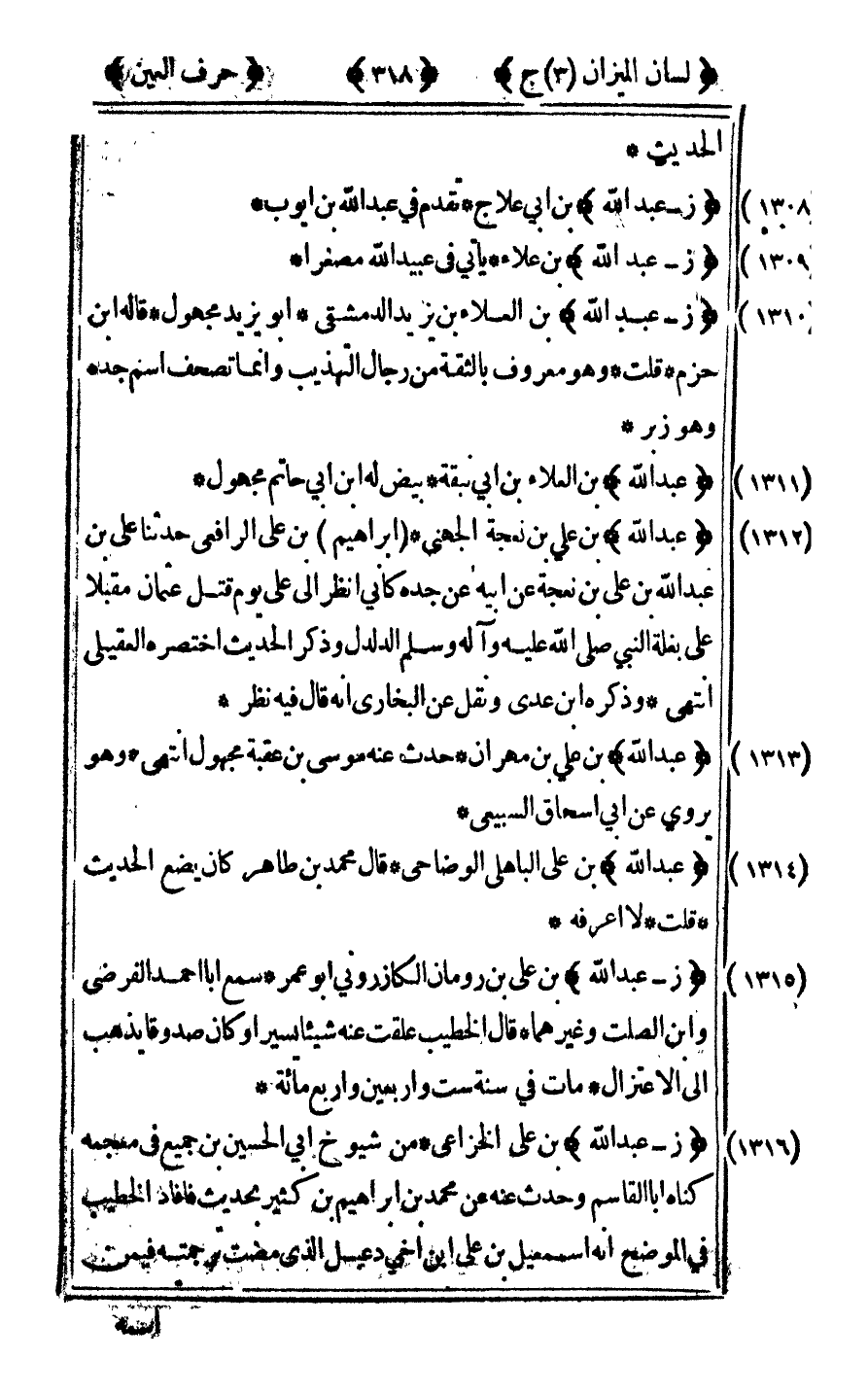 [1305] "عبد الله" ابن عطارد بن أذينة الطائي بصري لين قال ابن عدي منكر الحديث روى عن مسعر وغيره أحاديث لا يتابع عليها الخليل بن ميمون حدثنا عبد الله ابن أذينة عن هشام بن الغاز عن ابن المنكدر عن جابر رضي الله عنه