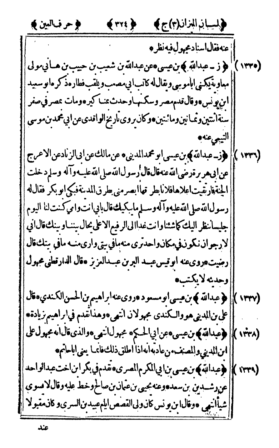 [1337] "عبد الله" ابن عيسى أبو مسعود روى عنه إبراهيم بن الحسن الكندي قال علي بن المديني هو والكندي مجهولان انتهى وهذا تقدم في إبراهيم بزيادة.