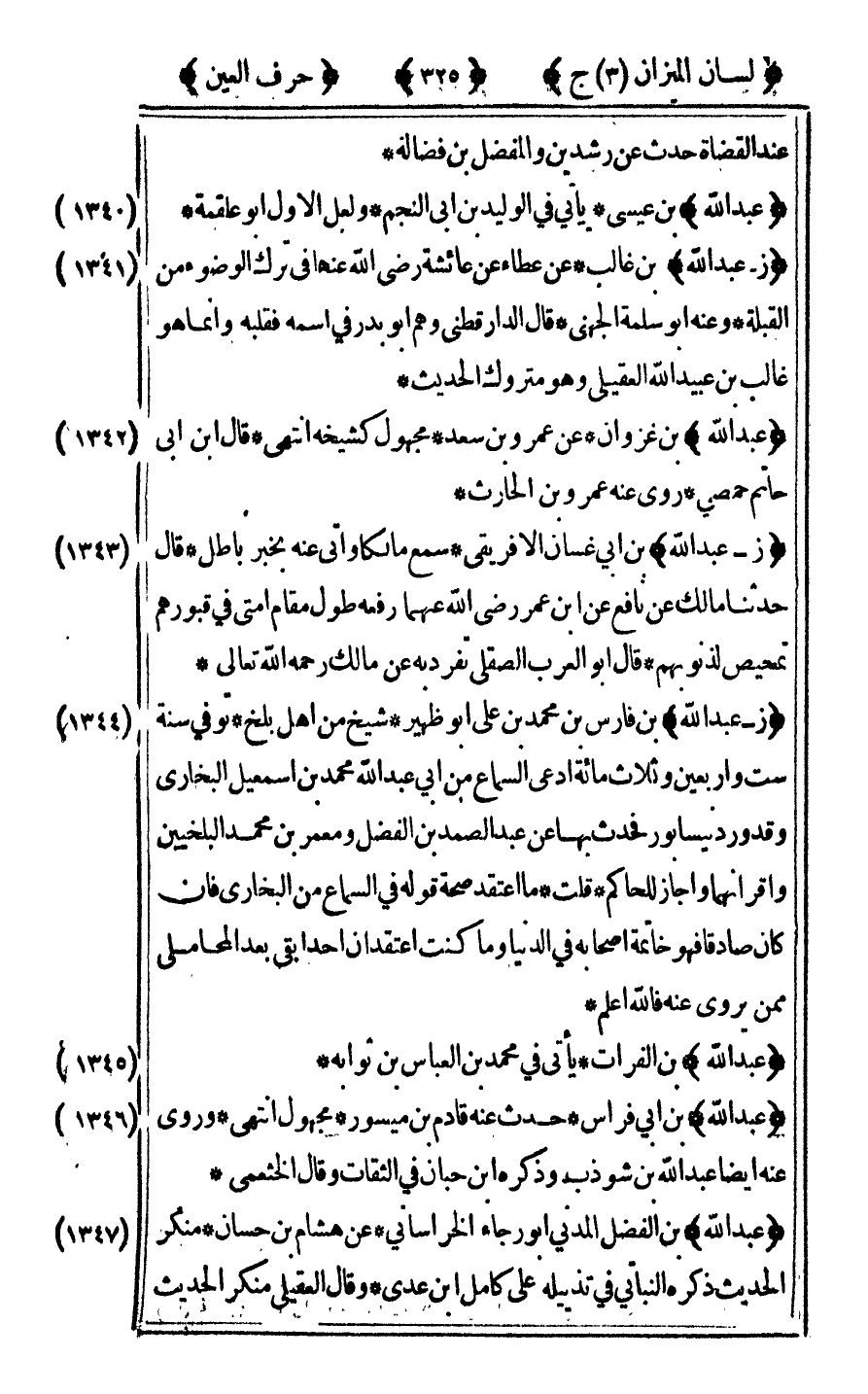 [1347] "عبد الله" ابن الفضل المدني أبو رجاء الخراساني عن هشام بن حسان منكر الحديث ذكره النباتي في تذييله على كامل بن عدي وقال العقيلي منكر الحديث