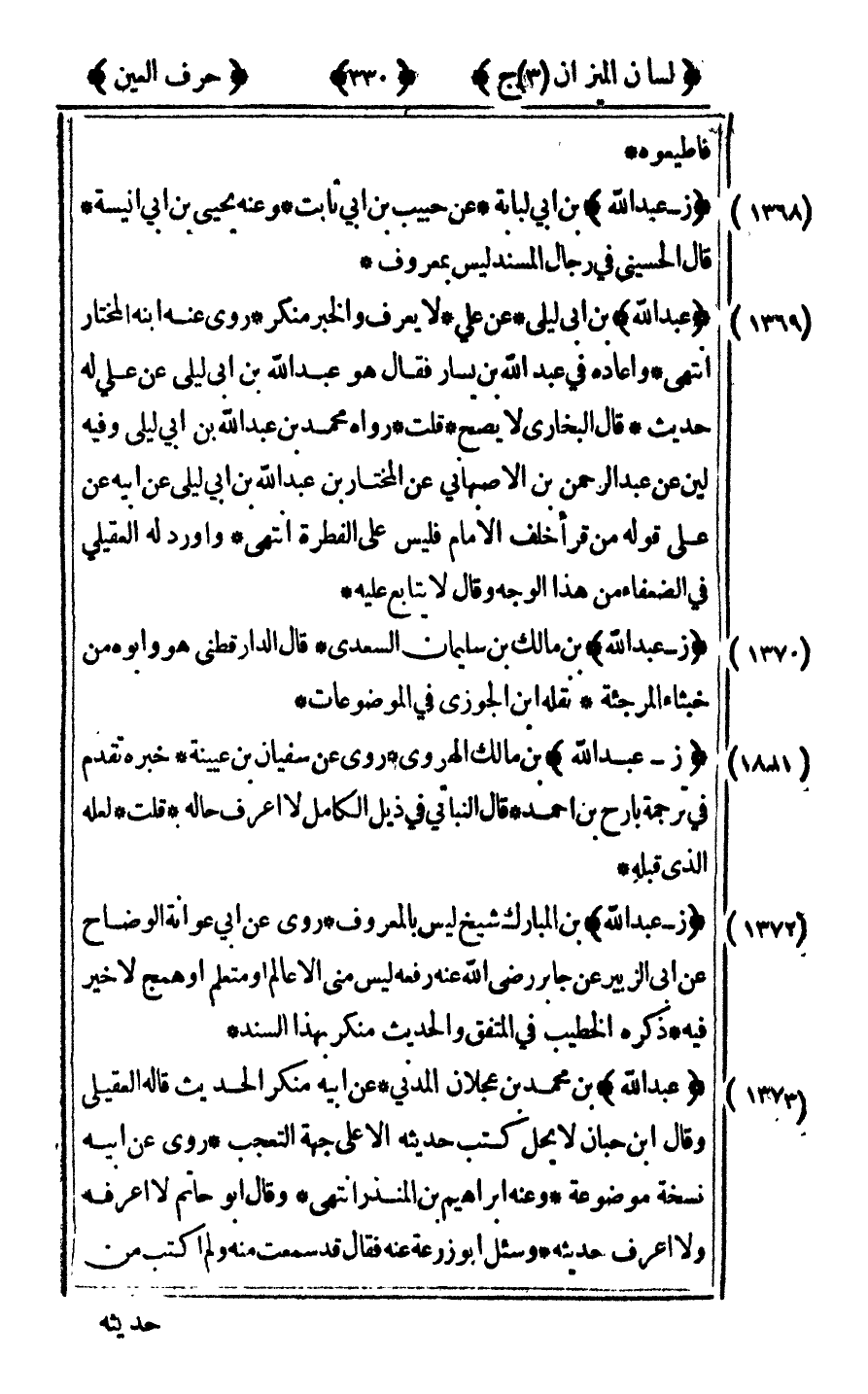 [1372] "ز - عبد الله" ابن المبارك شيخ ليس بالمعروف روى عن أبي عوانة الوضاح عن أبي الزبير عن جابر رضي الله عنه رفعه "ليس مني إلا عالم أو متعلم أو همج لاخير فيه" ذكره الخطيب في المتفق والحديث منكر بهذا السند.