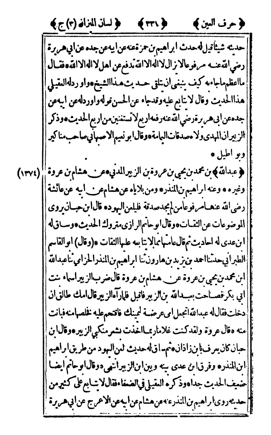 [1374] "عبد الله" ابن محمد بن يحيى بن عروة بن الزبير المدني عن هشام بن عروة وغيره وعنه إبراهيم بن المنذر ومن بلاياه عن هشام عن أبيه عن عائشة رضي الله عنها مرفوعا "من لم يجد صدقة فليلعن اليهود" قال ابن حبان يروي الموضوعات عن الثقات وقال أبو حاتم الرازي متروك الحديث وساق له ابن عدي له أحاديث ثم قال عامتها مما لا يتابعه عليها الثقات وقال أبو القاسم الطبراني حدثنا أحمد بن يزيد بن هارون ثنا إبراهيم بن المنذر الحزامي ثنا عبد الله ابن محمد بن يحيى بن عروة عن هشام بن عروة قال ضرب الزبير أسماء بنت أبي بكر فصاحت بعبد الله ابن الزبير فأقبل فلما رآه الزبير قال أمك طالق إن دخلت فقال له عبد الله أتجعل أمي عرضة ليمينك فاقتحم عليه فخلصها منه فبانت منه قال عروة ولقد كنت غلاما ربما أخذت بشعر منكبي الزبير وقال ابن حبان كان يعرف بابن زاذان ثم ساق له حديث لعن اليهود من طريق إبراهيم بن المنذر وفرق بن عدي بينه وبين بن الزبير انتهى وقال أبو حاتم أيضا ضعيف الحديث جدا وذكره العقيلي في الضعفاء فقال لا يتابع على كثير من حديثه روى إبراهيم بن المنذر عنه عن هشام عن أبيه عن الأعرج عن أبي هريرة