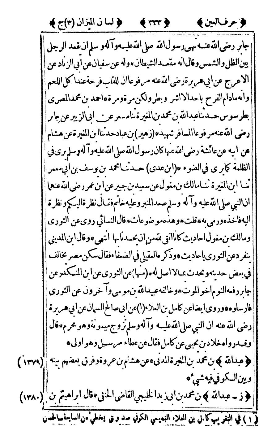 جابر رضي الله عنه نهى رسول الله صلى الله عليه وآله وسلم أن يقعد الرجل بين الظل والشمس وقال أنه مقعد الشيطان وله عن سفيان عن أبي الزناد عن الأعرج عن أبي هريرة رضي الله عنه مرفوعا "إن للقلب فرحة عند أكل اللحم وأنه ما دام الفرح بأحد إلا أشر وبطر ولكن مرة ومرة" أحمد بن محمد المصري بطرسوس حدثنا عبد الله ابن محمد بن المغيرة ثنا مسعر عن أبي الزبير عن جابر رضي الله عنه مرفوعا "المسافر شهيد" زهير بن عباد حدثنا بن المغيرة عن هشام عن أبيه عن عائشة رضي الله عنها كان رسول الله صلى الله عليه وآله وسلم يرى في الظلمة كما يرى في الضوء بن عدي حدثنا محمد بن يوسف بن أبي معمر ثنا بن المغيرة ثنا مالك بن مغول عن سعيد بن جبير عن ابن عمر رضي الله عنهما أن النبي صلى الله عليه وآله وسلم صعد المنبر وعليه خاتم فقال نظرة إليكم ونظرة إليه فأخذه ورمى به قلت وهذا موضوعات قال النسائي روى عن الثوري ومالك بن مغول أحاديث كانا اتقى لله من أن يحدثا بها انتهى وقال ابن المديني ينفرد عن الثوري بأحاديث وذكره العقيلي في الضعفاء فقال سكن مصر يخالف في بعض حديثه ويحدث بما لا أصل له منها عن الثوري عن ابن المنكدر عن جابر رفعه "النوم أخو الموت" وخالفه عبيد الله ابن موسى وآخرون عن الثوري فأرسلوه وروى أيضا عن كامل بن العلاء1 عن أبي صالح السمان عن أبي هريرة رضي الله عنه أن النبي صلى الله عليه وآله وسلم تزوج ميمونة وهو محرم قال وقد رواه خلاد بن يحيى عن كامل فقال عن عطاء مرسل وهو أولى.