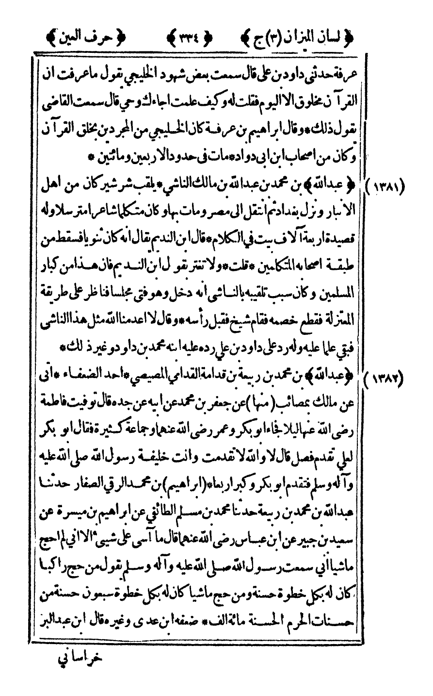 [1381] "عبد الله" ابن محمد بن عبد الله ابن مالك الناشي يلقب شرشير كان من أهل الأنبار ونزل بغداد ثم انتقل إلى مصر ومات بها وكان متكلما شاعرا مترسلا وله قصيدة أربعة آلاف بيت في الكلام قال ابن النديم يقال أنه كان ثنويا فسقط من طبقة أصحابه المتكلمين قلت ولا تغتر بقول بن النديم فان هذا من كبار المسلمين وكان سبب تلقيبه بالناشى أنه دخل وهو فتى مجلسا فناظر على طريقة المعتزلة فقطع خصمه فقام شيخ فقبل رأسه وقال لا أعدمنا الله مثل هذا الناشىء فبقي علما عليه وله رد على داود بن علي رده عليه ابنه محمد بن داود وغير ذلك.