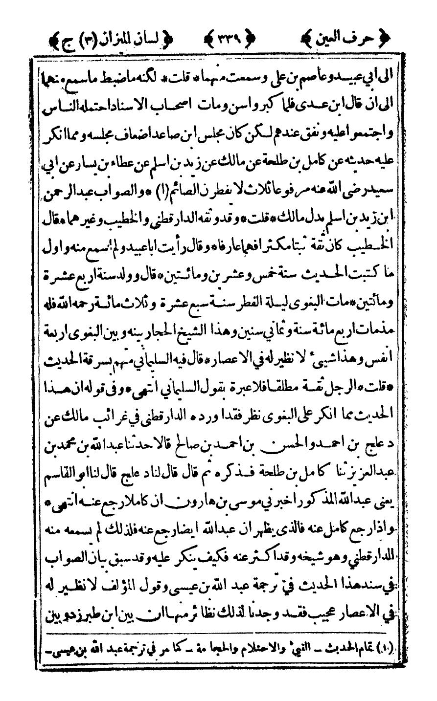 إلى أبي عبيد وعاصم بن علي وسمعت منهما قلت لكنه ما ضبط ما سمع منهما إلى أن قال ابن عدي فلما كبر وأسن ومات أصحاب الإسناد احتمله الناس واجتمعوا عليه ونفق عندهم لكن كان مجلس بن صاعد أضعاف مجلسه ومما أنكر عليه حديثه عن كامل بن طلحة عن مالك بن زيد عن أسلم عن عطاء بن يسار عن أبي سعيد رضي الله عنه مرفوعا "ثلاث لا يفطرن الصائم1" والصواب عبد الرحمن بن زيد بن أسلم بدل مالك قلت وقد وثقه الدارقطني والخطيب وغيرهما قال الخطيب كان ثقة ثبتا مكثرا فهما عارفا وقال رأيت أبا عبيد ولم أسمع منه وأول ما كتبت الحديث سنة خمس وعشرين ومائتين قال وولد سنة أربع عشرة ومائتين مات البغوي ليلة الفطر سنة سبع عشرة وثلاث مائة رحمه الله فله مذمات أربع مائة سنة وثمانى سنين وهذا الشيخ الحجار بينه وبين البغوي أربعة أنفس وهذا شيء لا نظير له في الإعصار قال فيه السليمانى متهم بسرقة الحديث قلت الرجل ثقة مطلقا فلا عبرة بقول السليمانى انتهى وفي قوله أن هذا الحديث مما أنكر على البغوي نظر فقد أورده الدارقطني في غرائب مالك عن دعلج بن أحمد والحسن بن أحمد بن صالح قالا حدثنا عبد الله ابن محمد بن عبد العزيز ثنا كامل بن طلحة فذكره ثم قال: قال لنا دعلج قال لنا أبو القاسم يعنى عبد الله المذكور أخبرني موسى بن هارون أن كاملا رجع عنه انتهى وإذا رجع كامل عنه فالذي يظهر أن عبد الله أيضا رجع عنه فلذلك لم يسمعه منه الدارقطني وهو شيخه وقد أكثر عنه فكيف ينكر عليه وقد سبق بيان الصواب في سند هذا الحديث في ترجمة عبد الله ابن عيسى وقول المؤلف لا نظير له في الإعصار عجيب فقد وجدنا لذلك نظائر منها أن بين ابن طبرزد وبين