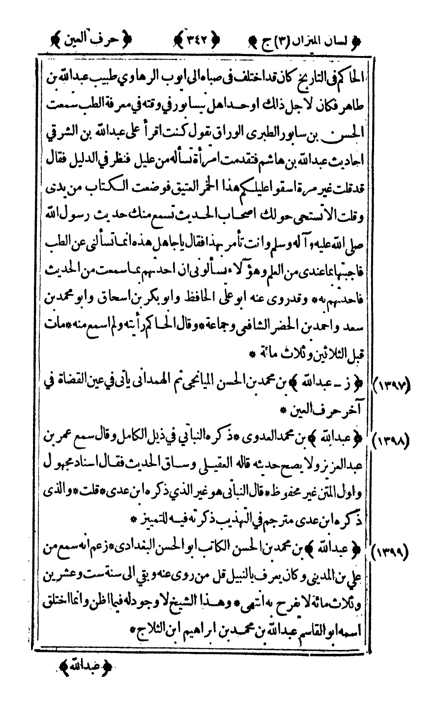 [1397] "ز - عبد الله" ابن محمد بن الحسن الميانجي ثم الهمداني يأتي في عين القضاة في آخر حرف العين.