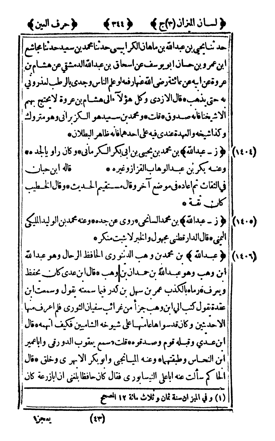 [1404] "ز - عبد الله" ابن محمد بن يحيى بن أبي بكر الكرماني وكان راويا لجده وعنه بكر بن عبد الوهاب القزاز وغيره قاله ابن حبان في الثقات ثم أعاده في موضع آخر وقال مستقيم الحديث وقال الخطيب كان ثقة.
