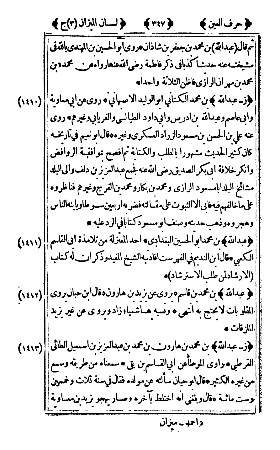 [1411] "عبد الله" ابن محمد أبو الحسين البغدادي أحد المعتزلة من تلامذة أبي القاسم الكعبي قال ابن النديم في الفهرست أفادنيه الشيخ المفيد وذكر أن له كتاب الإرشاد لمن طلب الاسترشاد.