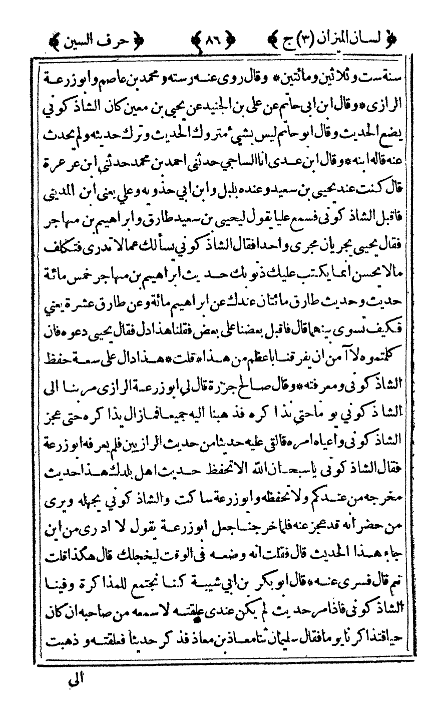 سنة ست وثلاثين ومائتين وقال روى عنه رسته ومحمد بن عاصم وأبو زرعة الرازي وقال ابن أبي حاتم عن علي بن الجنيد عن يحيى بن معين كان الشاذكوني يضع الحديث وقال أبو حاتم ليس بشيء متروك الحديث وترك حديثه ولم يحدث عنه قاله ابنه وقال ابن عدي أنا الساجي حدثني أحمد بن محمد حدثني بن عرعرة قال كنت عند يحيى بن سعيد وعنده بلبل وابن أبي حذويه وعلي يعنى بن المديني فاقبل الشاذكوني فسمع عليا يقول ليحيى بن سعيد طارق وإبراهيم بن مهاجر فقال يحيى يجريان مجرى واحدا فقال الشاذكوني يسألك عما لا تدرى فتكلف ما لا يحسن إنما يكتب عليك ذنوبك حديث إبراهيم بن مهاجر خمس مائة حديث وحديث طارق مائتان عندك عن إبراهيم مائة وعن طارق عشرة يعنى فكيف تسوى بينهما قال فاقبل بعضنا على بعض فقلنا هذا دل فقال يحيى دعوه فإن كلمتموه لا آمن أن يفرقنا بأعظم من هذا قلت هذا دال على سعة حفظ الشاذكوني ومعرفته وقال صالح جزرة قال لي أبو زرعة الرازي مر بنا إلى الشاذكوني يوما حتى نذاكره فذهبنا إليه جميعا فما زال يذاكره حتى عجز الشاذكوني وأعياه أمره فألقى عليه حديثا من حديث الرازيين فلم يعرفه أبو زرعة فقال الشاذكوني يا سبحان الله ألا تحفظ حديث أهل بلدك هذا حديث مخرجه من عندكم ولا تحفظه وأبو زرعة ساكت والشاذكونى يجهله ويرى من حضر أنه قد عجز عنه لما خرجنا جعل أبو زرعة يقول لا أدري من أين جاء هذا الحديث قال فقلت أنه وضعه في الوقت ليخجلك قال هكذا قلت نعم قال فسرى عنه قال أبو بكر بن أبي شيبة كنا نجتمع للمذاكرة وفينا الشاذكوني فإذا مر حديث لم يكن عندي علقته لأسمعه من صاحبه إن كان حيا فتذاكرنا يوما فقال سليمان ثنا معاذ بن معاذ فذكر حديثا فعلقته وذهبت