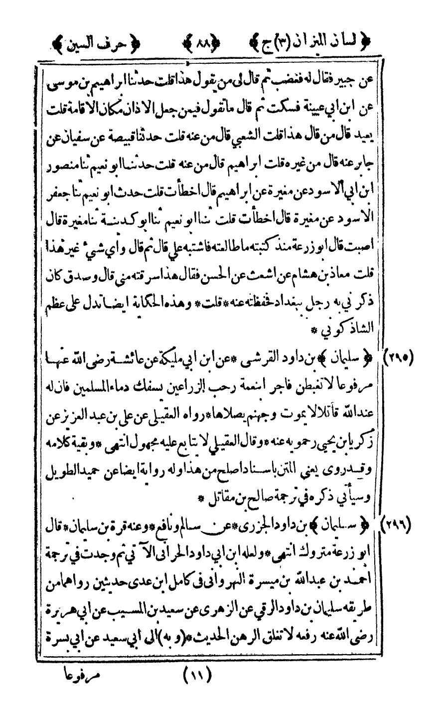 [296] "سليمان" ابن داود الجزري عن سالم ونافع وعنه قرة بن سليمان قال أبو زرعة متروك انتهى ولعله ابن أبي داود الحراني الآتي ثم وجدت في ترجمة أحمد بن عبد الله ابن ميسرة النهرواني في كامل بن عدي حديثين رواهما من طريقه سليمان ابن داود الرقى عن الزهرى عن سعيد بن المسيب عن أبي هريرة رضي الله عنه رفعه لا تغلق الرهن الحديث وبه إلى أبي سعيد عن أبي بسرة