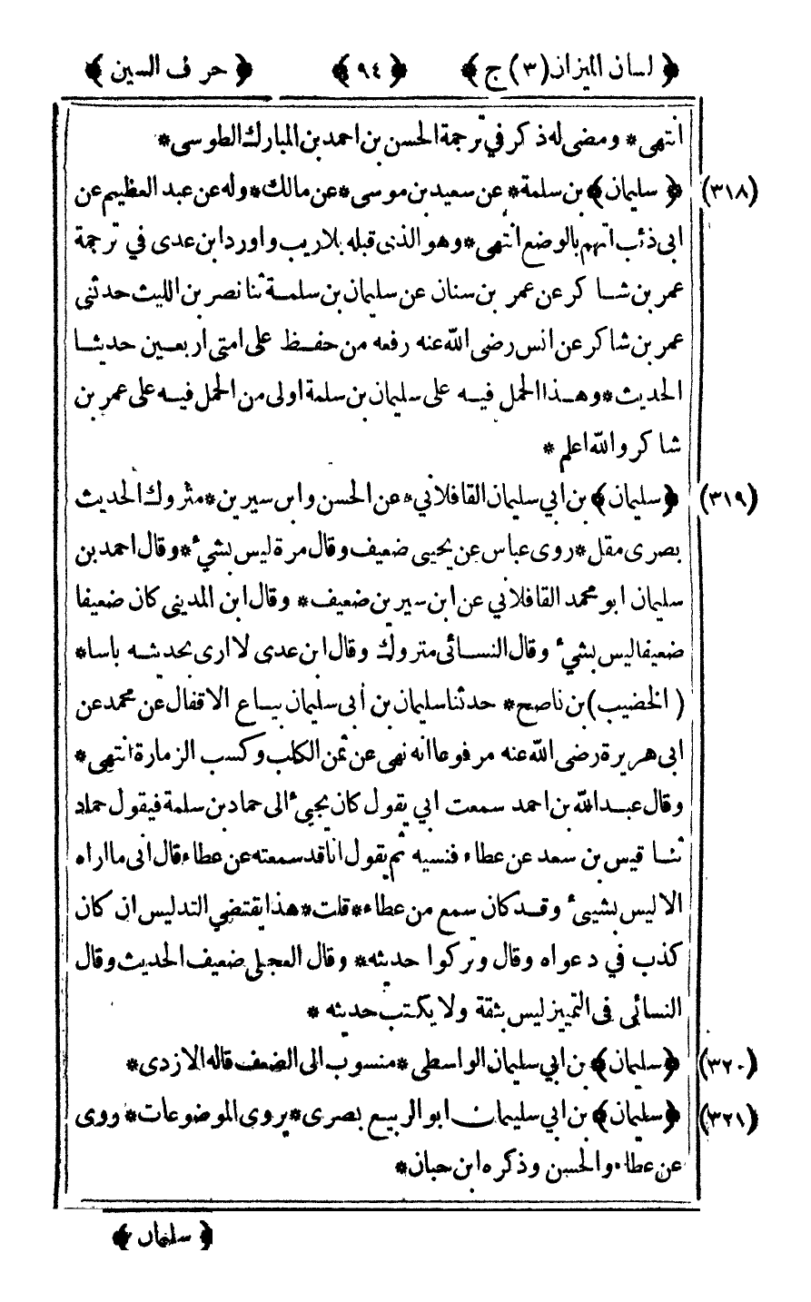 [320] "سليمان" ابن أبي سليمان الواسطي منسوب إلى الضعف قاله الأزدي.