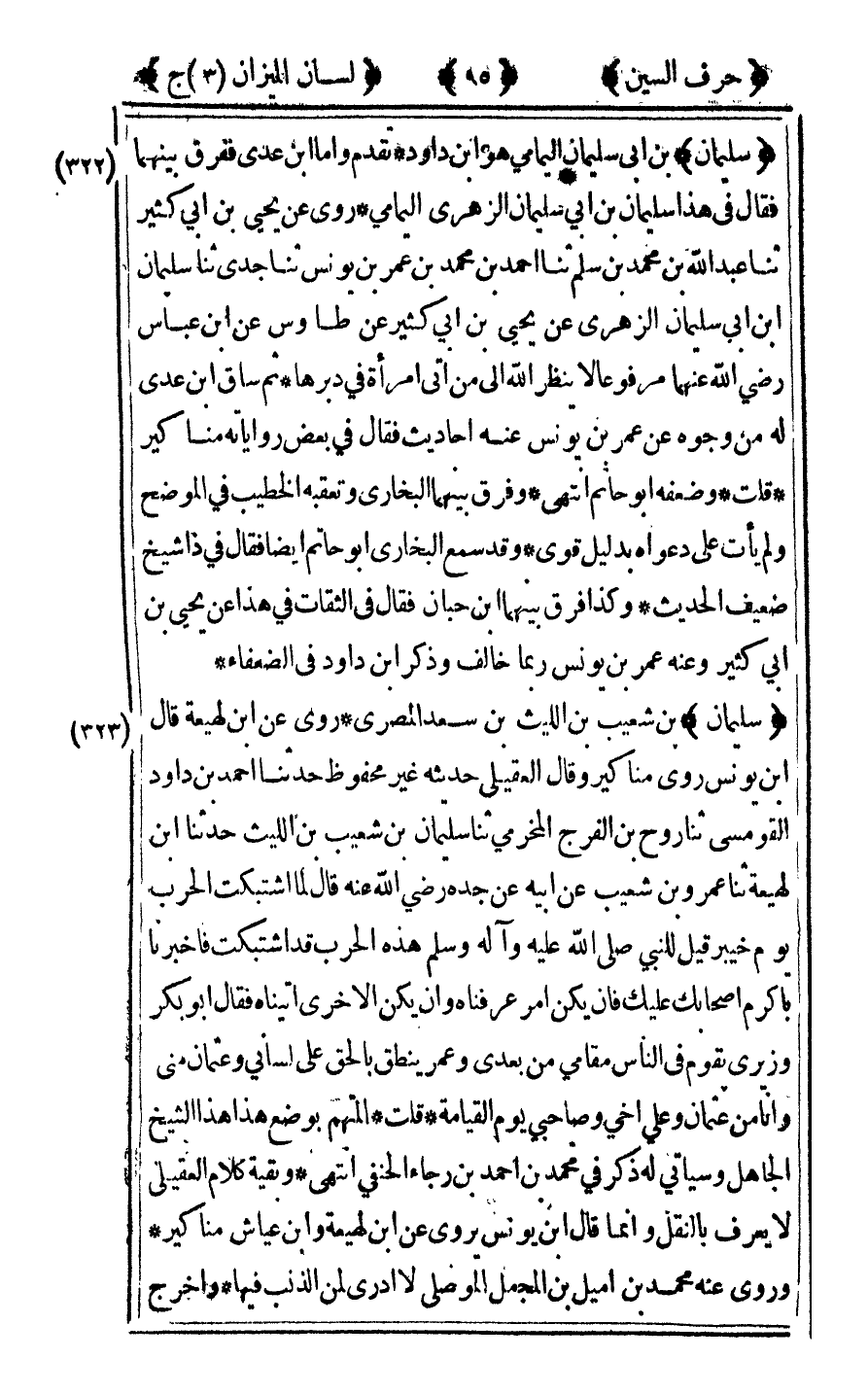 [322] "سليمان" ابن أبي سليمان اليمامي هو بن داود تقدم وأما ابن عدي ففرق بينهما فقال في هذا سليمان ابن أبي سليمان الزهري اليمامي روى عن يحيى بن أبي كثير ثنا عبد الله ابن محمد بن سلم ثنا أحمد بن محمد بن عمر بن يونس ثنا جدي ثنا سليمان ابن أبي سليمان الزهري عن يحيى بن أبي كثير عن طاوس عن ابن عباس رضي الله عنهما مرفوعا "لا ينظر الله إلى من أتى امرأة في دبرها" ثم ساق بن عدي له من وجوه عن عمر بن يونس عنه أحاديث فقال في بعض رواياته مناكير قلت وضعفه أبو حاتم انتهى وفرق بينهما البخاري وتعقبه الخطيب في الموضح ولم يأت على دعواه بدليل قوى وقد سمع البخاري أبو حاتم أيضا فقال في ذا شيخ ضعيف الحديث وكذا فرق بينهما بن حبان فقال في الثقات في هذا عن يحيى بن أبي كثير وعنه عمر بن يونس ربما خالف وذكر بن داود في الضعفاء.