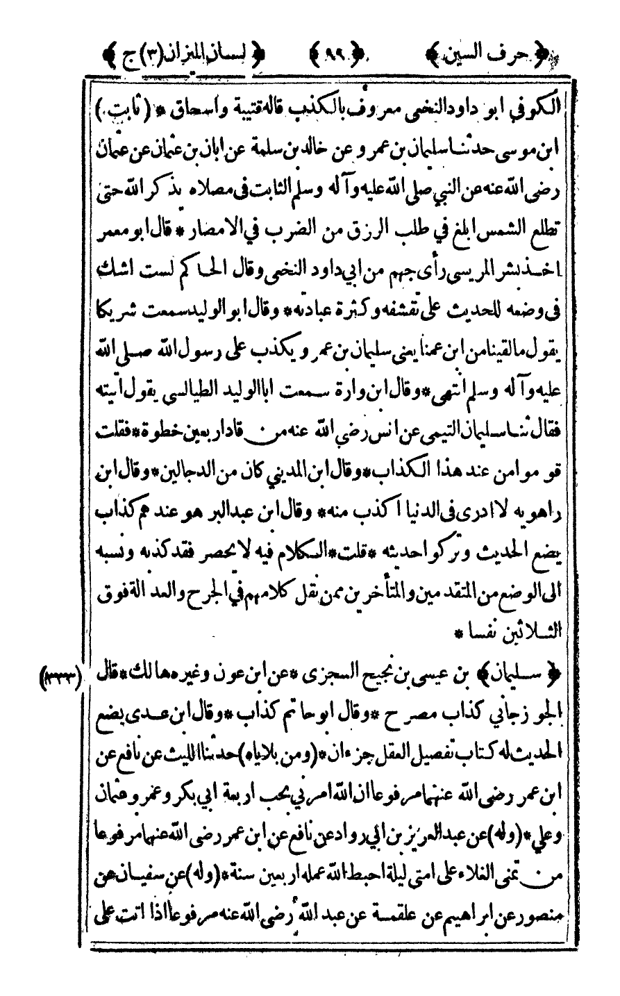 الكوفي أبو داود النخعي معروف بالكذب قاله قتيبة وإسحاق ثابت بن موسى حدثنا سليمان ابن عمرو عن خالد بن سلمة عن أب أن ابن عثمان عن عثمان رضي الله عنه عن النبي صلى الله عليه وآله وسلم: "الثابت في مصلاه يذكر الله حتى تطلع الشمس أبلغ في طلب الرزق من الضرب في الأمصار" قال أبو معمر أخذ بشر المريسي رأي جهم من أبي داود النخعي وقال الحاكم لست أشك في وضعه للحديث على تقشفه وكثرة عبادته وقال أبو الوليد سمعت شريكا يقول ما لقينا من بن عمنا يعنى سليمان ابن عمرو يكذب على رسول الله صلى الله عليه وآله وسلم انتهى وقال أبو وارة سمعت أبا الوليد الطيالسي يقول اتيته فقال ثنا سليمان التيمي عن أنس رضي الله عنه من قاد أربعين خطوة فقلت قوموا من عند هذا الكذاب وقال ابن المديني كان من الدجالين وقال ابن راهويه لا أدري في الدنيا أكذب منه وقال ابن عبد البر هو عندهم كذاب يضع الحديث وتركوا حديثه قلت الكلام فيه لا يحصر فقد كذبه ونسبه إلى الوضع من المتقدمين والمتأخرين ممن نقل كلامهم في الجرح والعدالة فوق الثلاثين نفسا.