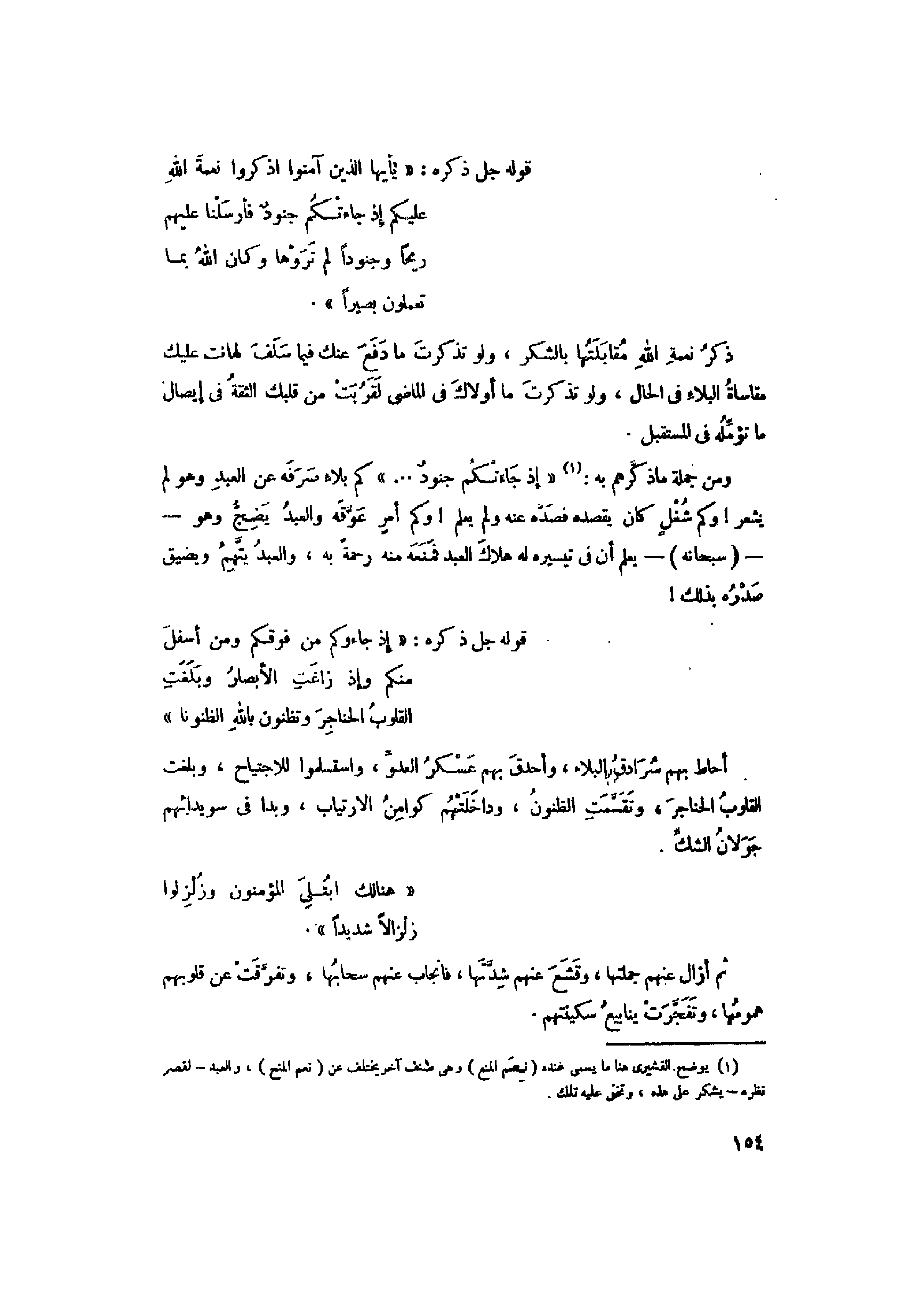 ومن جملة ما ذكّرهم به: «1» «إِذْ جاءَتْكُمْ جُنُودٌ ... » كم بلاء صرفه عن العبد وهو لم يشعر! وكم شغل كان يقصده فصدّه عنه ولم يعلم! وكم أمر عوّقه والعبد يضجّ وهو-- (سبحانه) - يعلم أن في تيسيره له هلاك العبد فمنعه منه رحمة به، والعبد يتّهم ويضيق صدره بذلك! قوله جل ذكره: