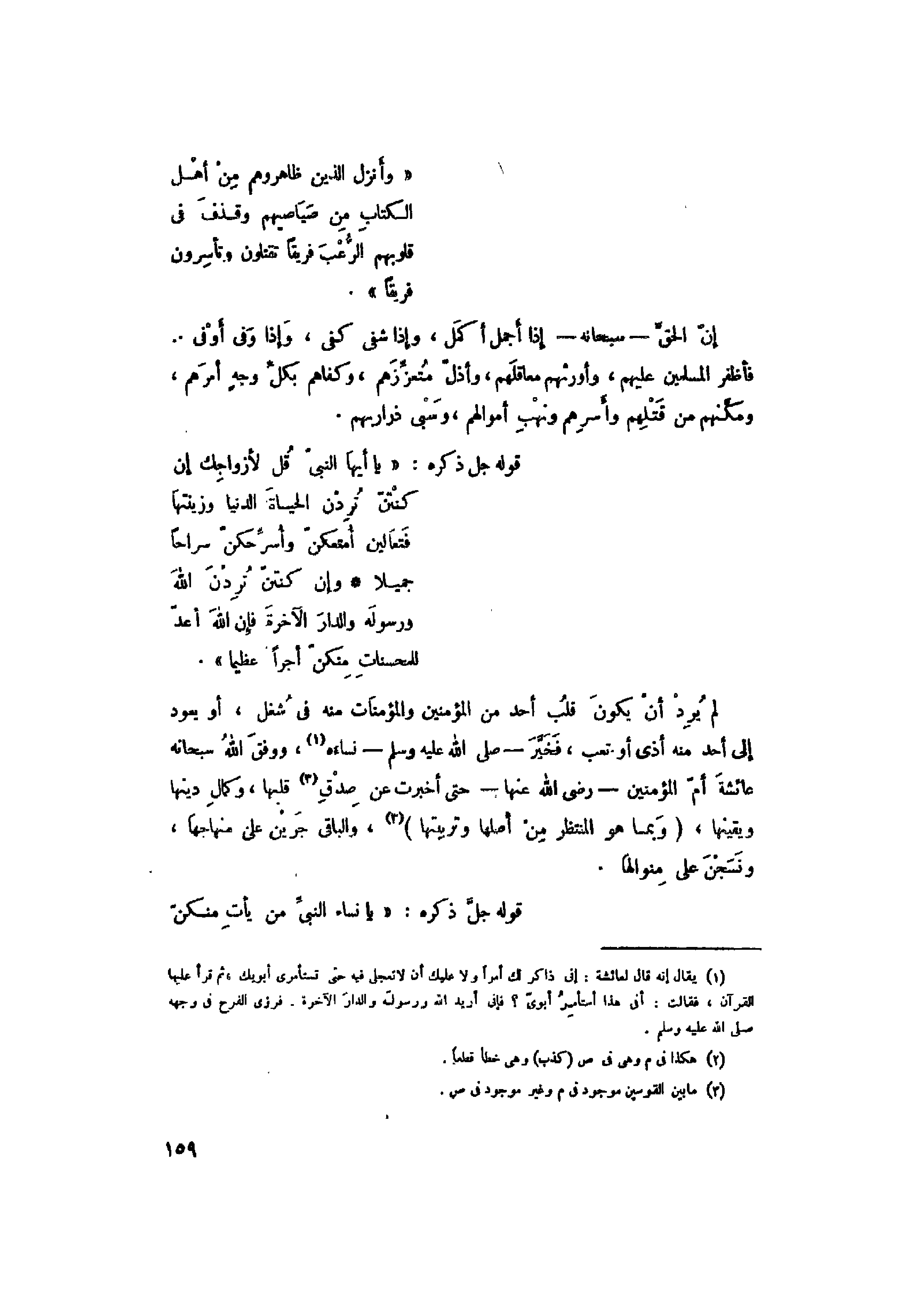 لم يرد أن يكون قلب أحد من المؤمنين والمؤمنات منه في شغل، أو يعود إلى أحد منه أذى أو تعب، فخيّر- صلى الله عليه وسلم- نساءه «1» ، ووفق الله سبحانه عائشة أمّ المؤمنين- رضى الله عنها- حتى أخبرت عن صدق «2» قلبها، وكمال دينها ويقينها، (وبما هو المنتظر من أصلها وتربيتها) «3» ، والباقي جرين على منهاجها، ونسجن على منوالها.