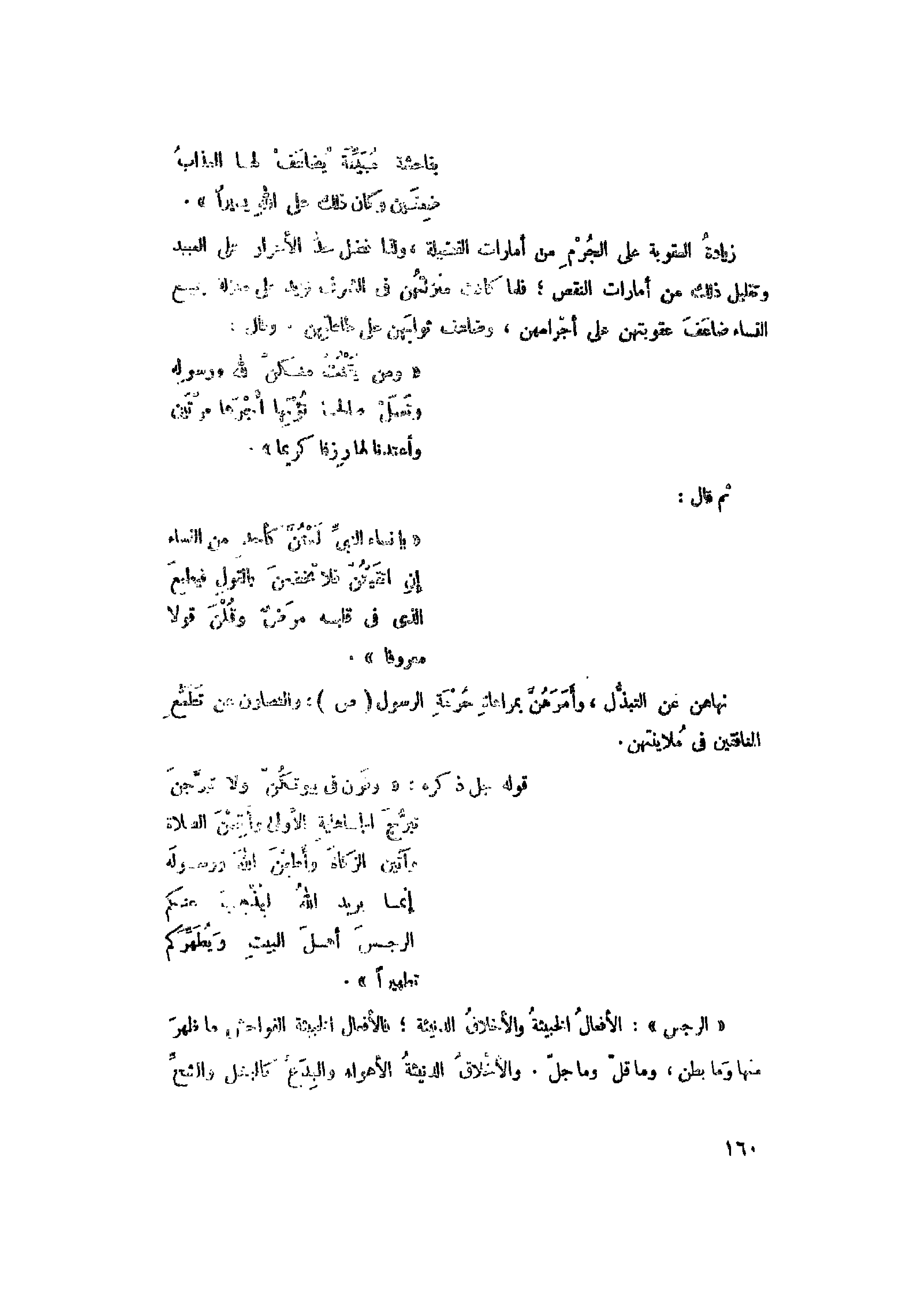 يا نِساءَ النَّبِيِّ لَسْتُنَّ كَأَحَدٍ مِنَ النِّساءِ إِنِ اتَّقَيْتُنَّ فَلا تَخْضَعْنَ بِالْقَوْلِ فَيَطْمَعَ الَّذِي فِي قَلْبِهِ مَرَضٌ وَقُلْنَ قَوْلاً مَعْرُوفاً (32)