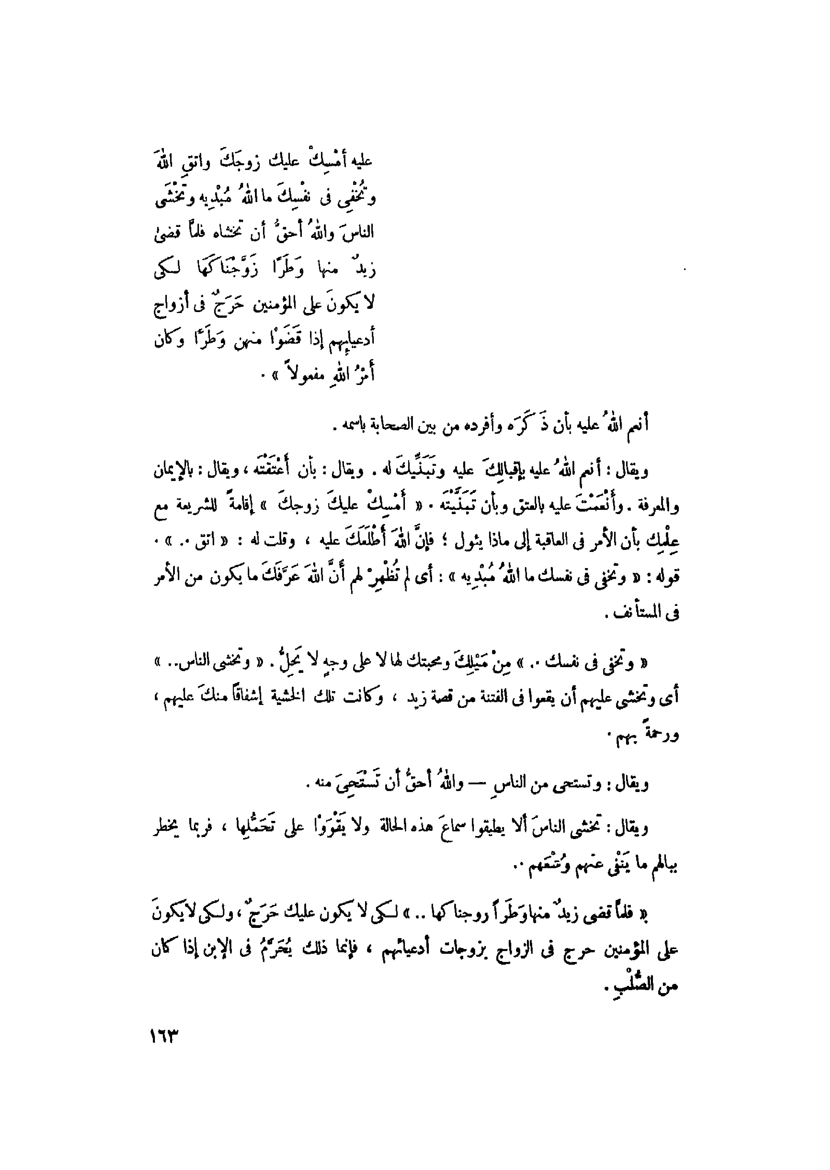 «فَلَمَّا قَضى زَيْدٌ مِنْها وَطَراً زَوَّجْناكَها..» لكى لا يكون عليك حرج، ولكى لا يكون على المؤمنين حرج في الزواج بزوجات أدعيائهم، فإنما ذلك يحرّم في الابن إذا كان من الصّلب.