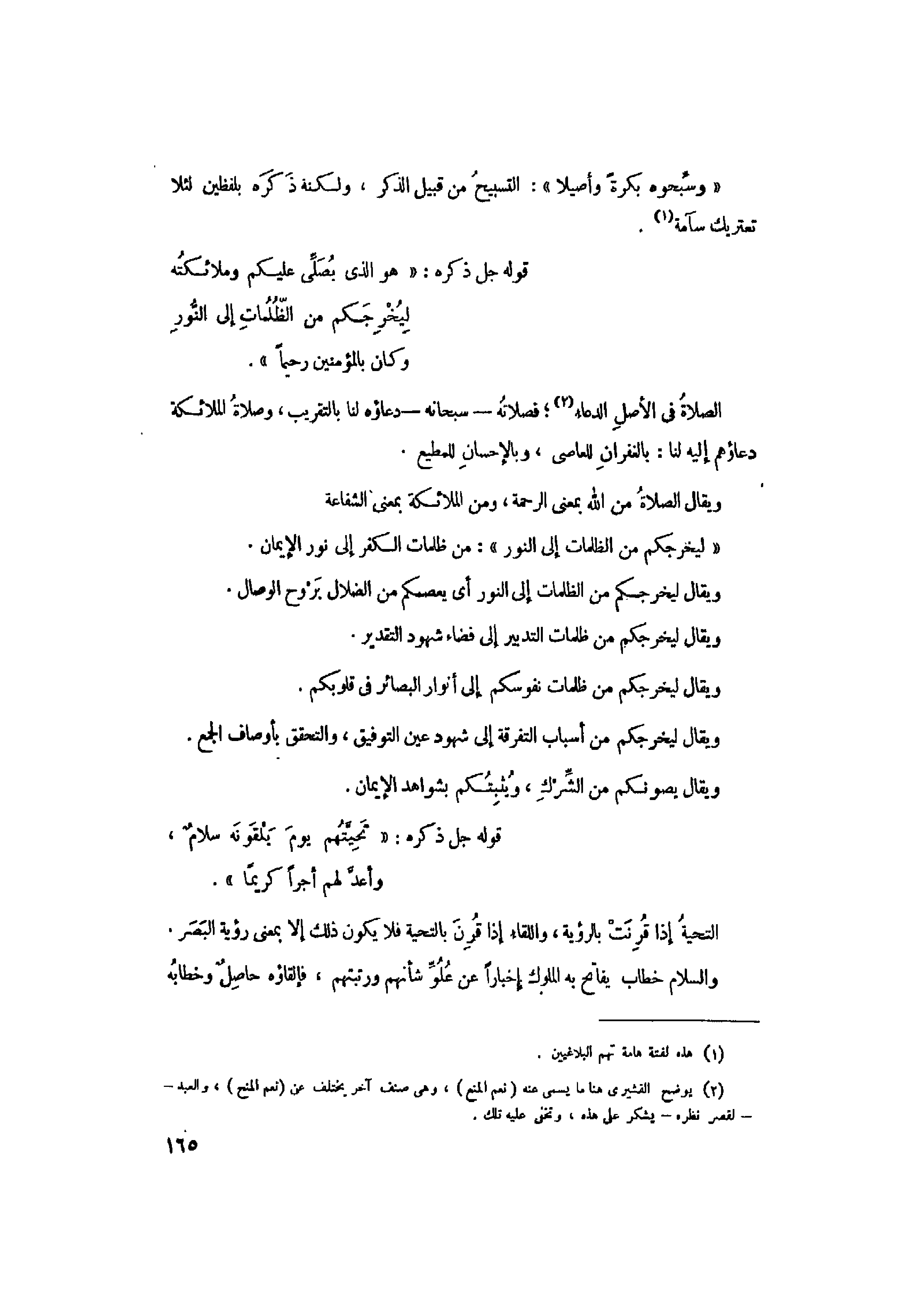 الصلاة في الأصل الدعاء «2» فصلاته- سبحانه- دعاؤه لنا بالتقريب، وصلاة الملائكة دعاؤهم إليه لنا: بالغفران للعاصى، وبالإحسان للمطيع.
