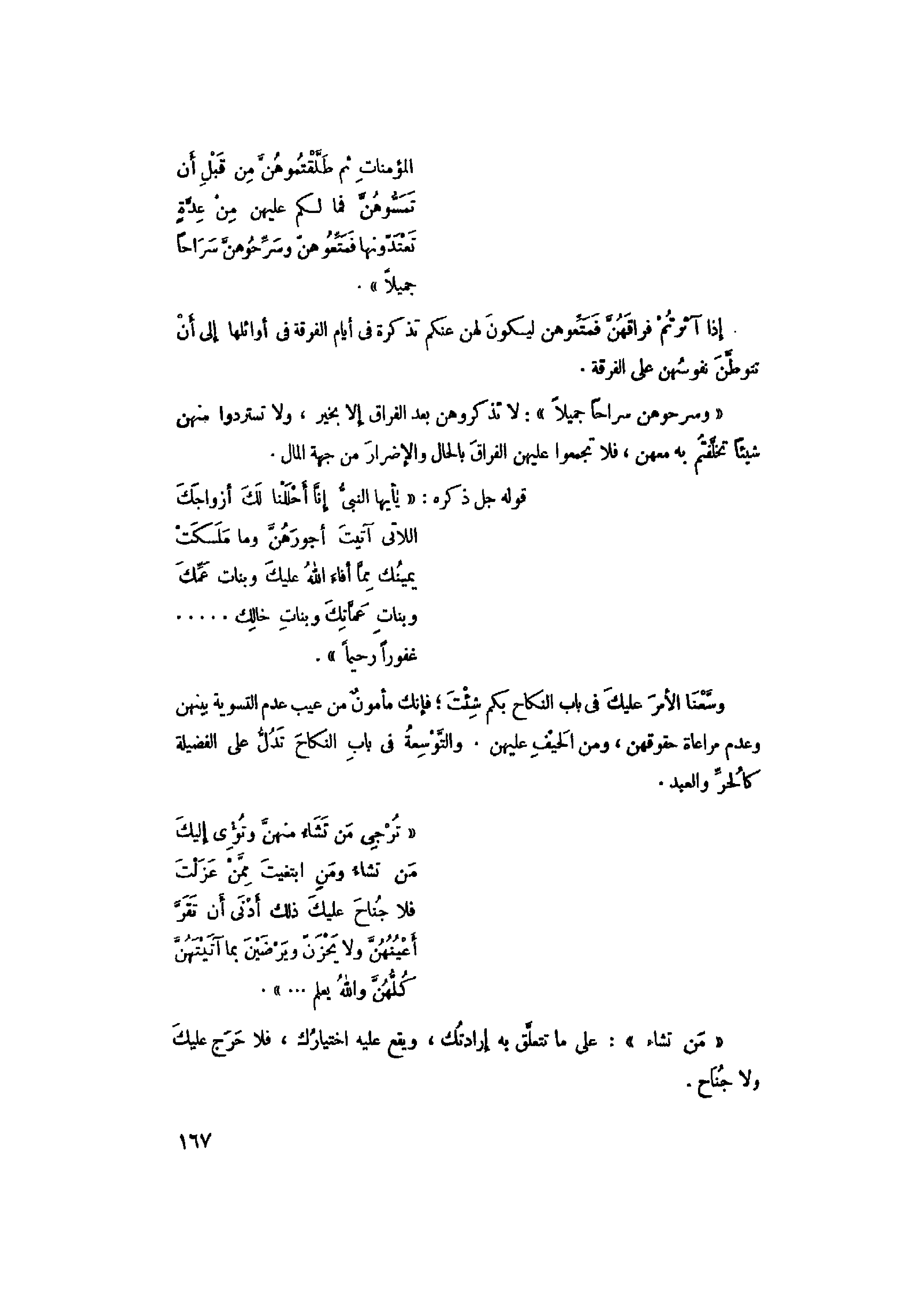 «تُرْجِي مَنْ تَشاءُ مِنْهُنَّ وَتُؤْوِي إِلَيْكَ مَنْ تَشاءُ وَمَنِ ابْتَغَيْتَ مِمَّنْ عَزَلْتَ فَلا جُناحَ عَلَيْكَ ذلِكَ أَدْنى أَنْ تَقَرَّ أَعْيُنُهُنَّ وَلا يَحْزَنَّ وَيَرْضَيْنَ بِما آتَيْتَهُنَّ كُلُّهُنَّ وَاللَّهُ يَعْلَمُ ... »