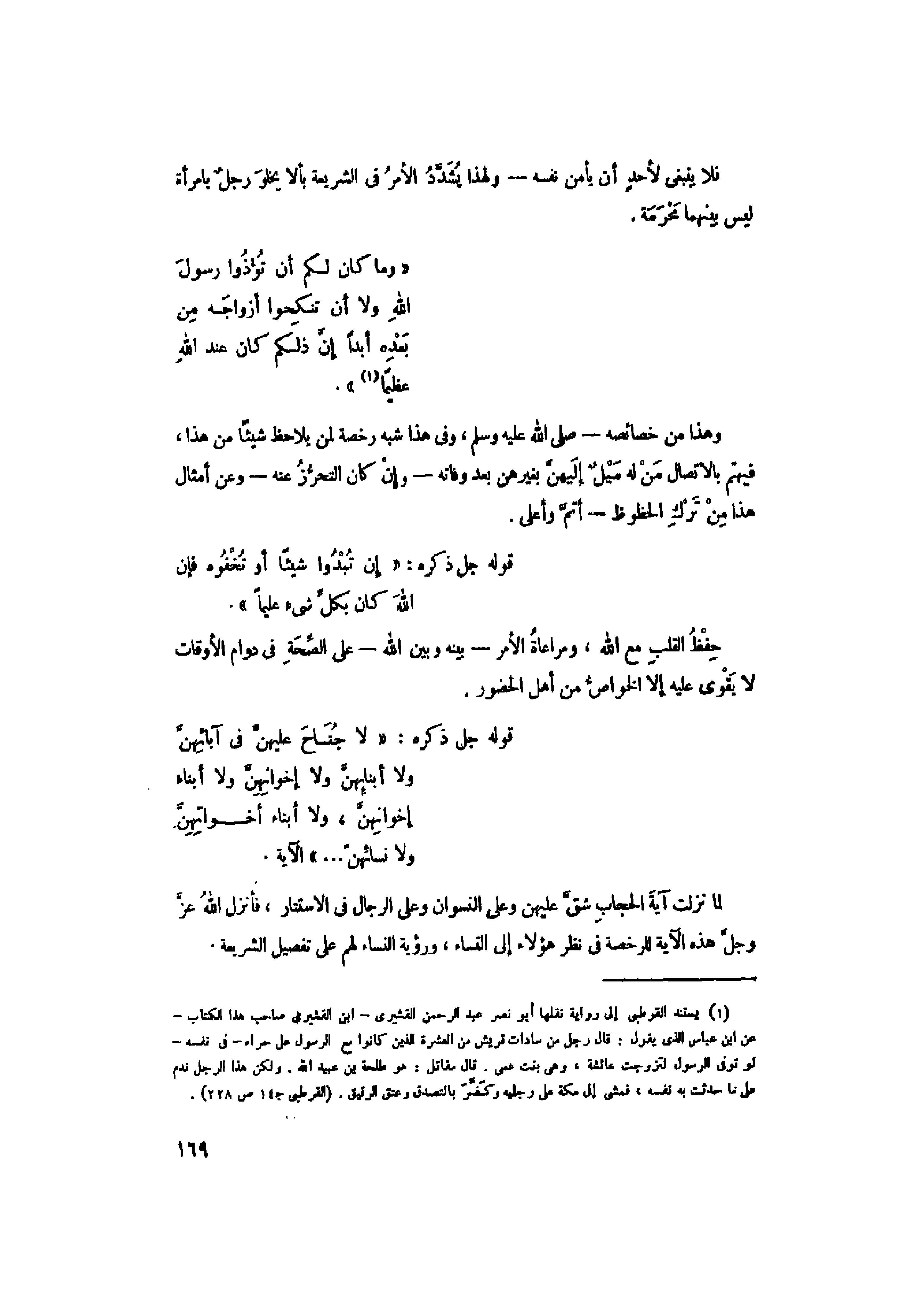 (1) يستند القرطبي إلى رواية نقلها أبو نصر عبد الرحمن القشيري- ابن القشيري صاحب هذا الكتاب- عن ابن عباس الذي يقول: قال رجل من سادات قريش من العشرة الذين كانوا مع الرسول على حراء- فى نفسه- لو توفى الرسول لتزوجت عائشة، وهي بنت عمى. قال مقاتل: هو طلحة بن عبيد الله. ولكن هذا الرجل ندم على ما حدثت به نفسه، فمشى إلى مكة على رجليه وكفّر بالتصدق وعتق الرقيق. (القرطبي ج 14 ص 228) .